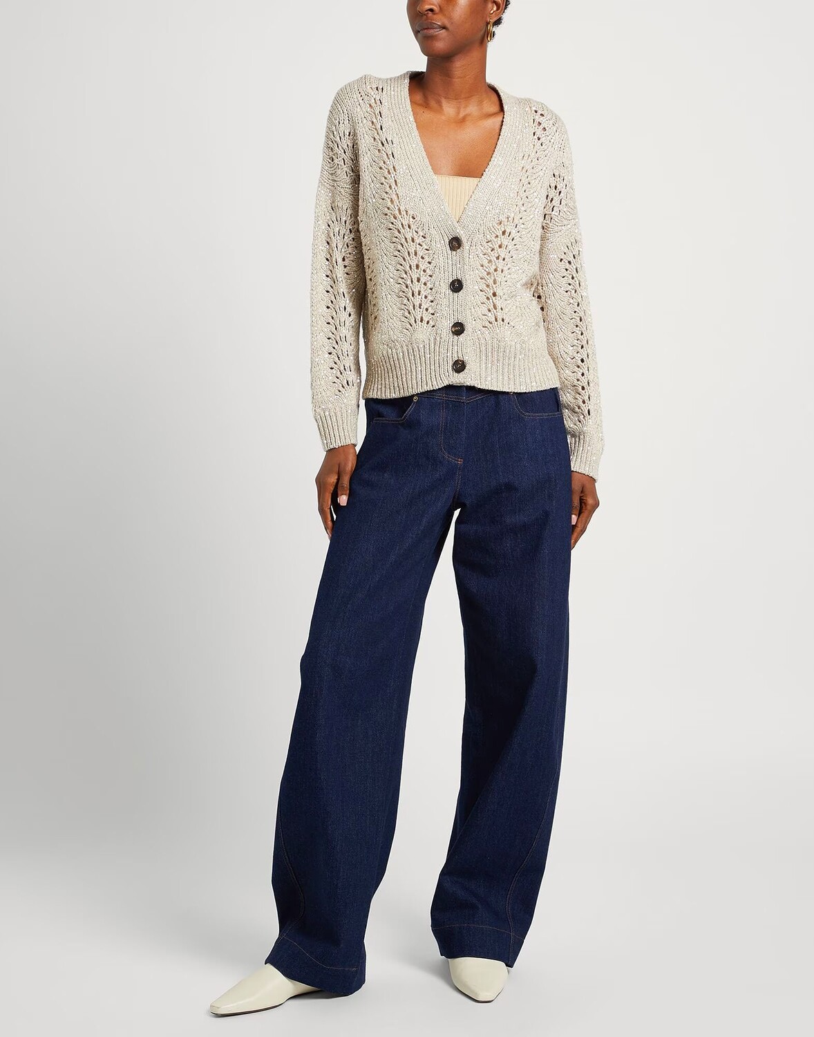 Трикотаж, средней плотности, пайетки, одноцветное изделие с аппликациями, длинные рукава, застежка на пуговицы, без карманов, содержит нетекстильные части животного происхождения, ручная стирка или химчистка, не отбеливать, не подвергать машинной сушке