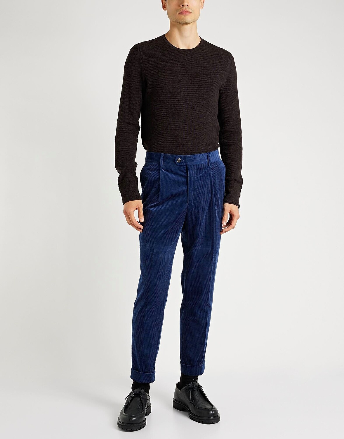 Брюки, вельвет, в рубчик, без аппликаций, одноцветное изделие, завышенная талия, шлевки для ремня, зауженные брючины, стандартный крой, 1 пуговица, подвернутый низ, множество карманов