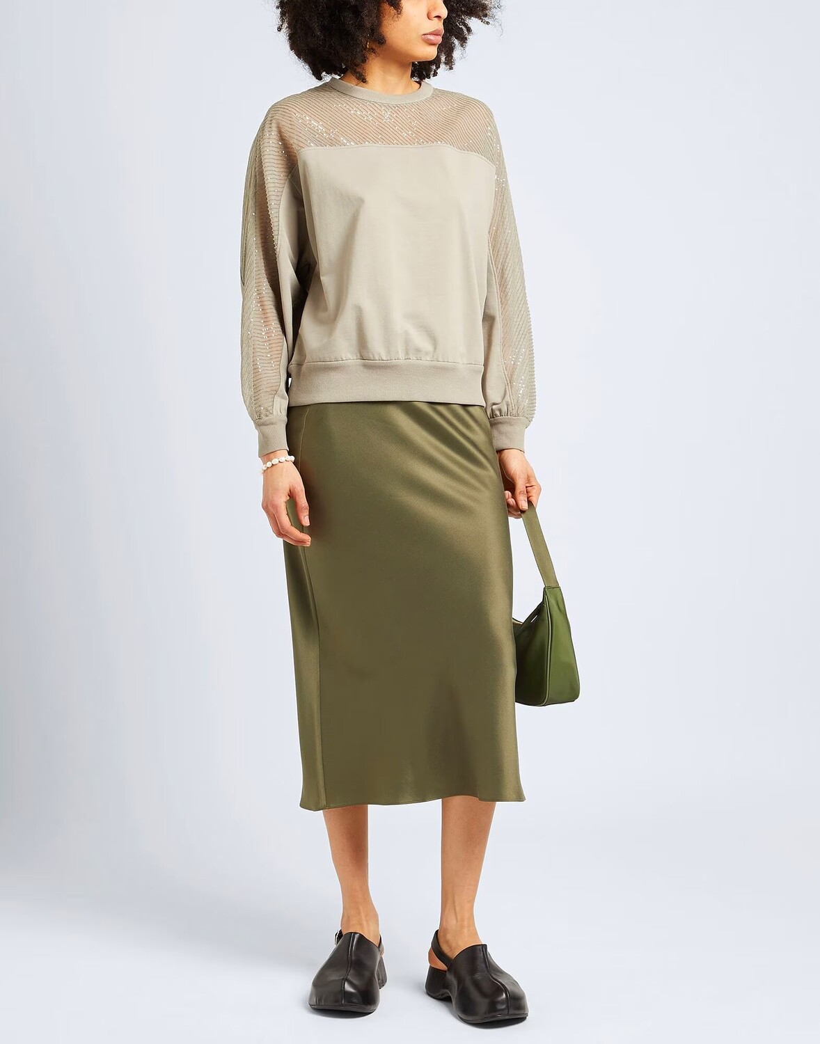 Френч терри, органза, пайетки, одноцветное изделие с аппликациями, круглый вырез, длинные рукава, без карманов, стрейч, содержит нетекстильные части животного происхождения, химчистка, нельзя сушить в стиральной машине, не отбеливать