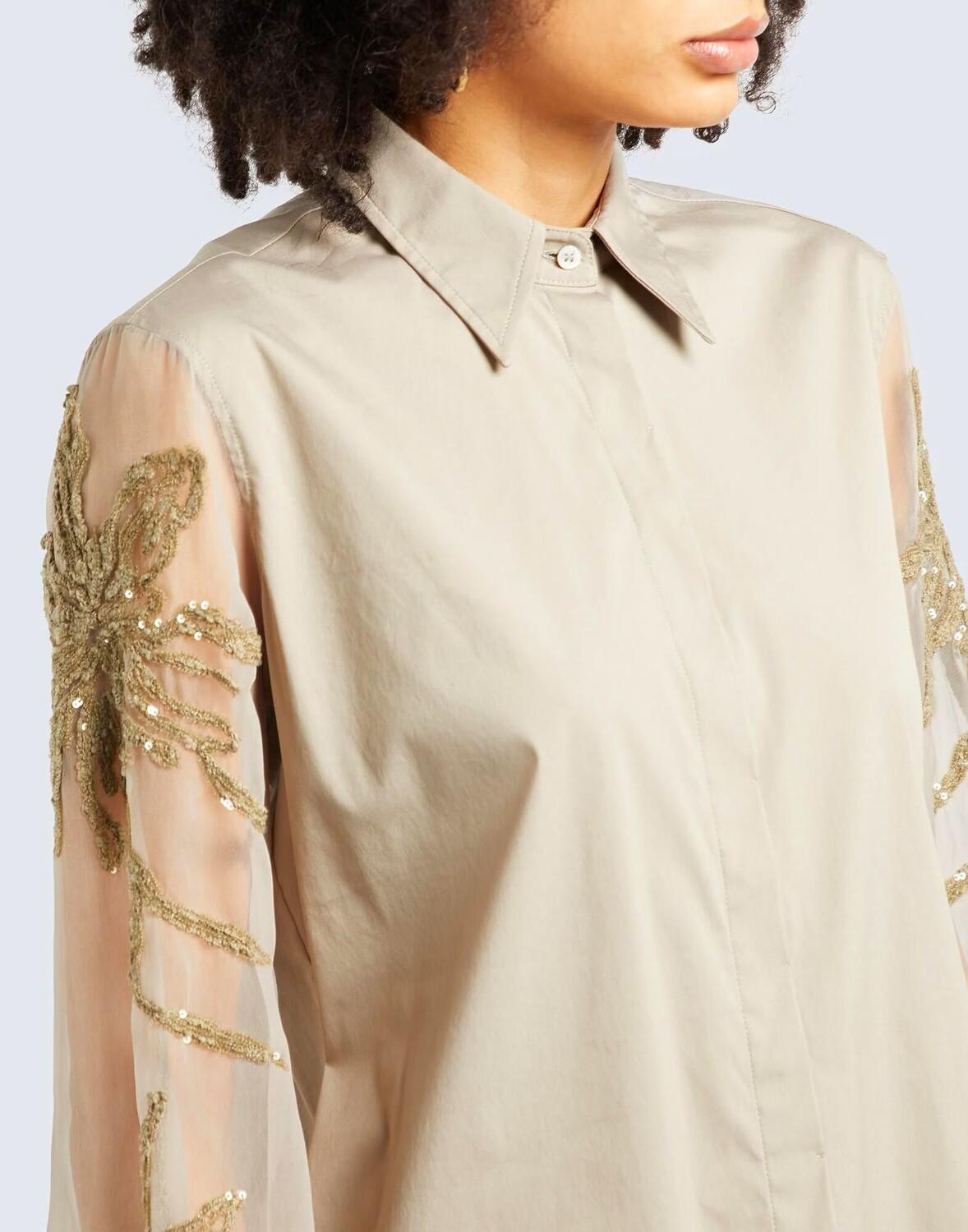 Поплин, органза, вышивка, пайетки, одноцветное изделие с аппликациями, воротник классический, длинные рукава, манжеты на пуговицах, застежка на пуговицах, без карманов, стрейч, содержит нетекстильные части животного происхождения, химчистка, нельзя сушить в стиральной машине, не отбеливать , рубашка