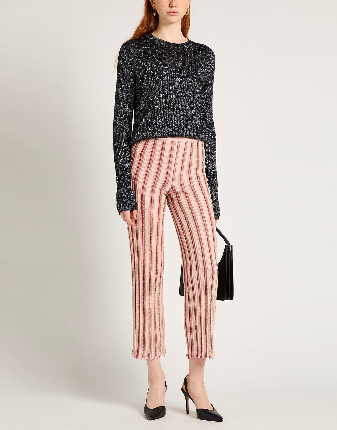 Брюки прямого кроя, трикотажные, металлик, легкий трикотаж, без аппликаций, в полоску, завышенная талия, талия на резинке, стандартного кроя, на подкладке, без карманов, химчистка, не отбеливать, нельзя сушить в стиральной машине, нельзя гладить