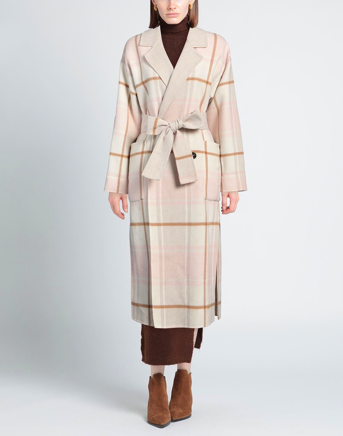 Пальто с поясом, фетр, клетка, ремень, воротник с лацканами, длинные рукава, без подкладки, застежка на пуговицы, множество карманов, разрезы по бокам, двустороннее лицо, химчистка, нельзя отбеливать, нельзя сушить в стиральной машине