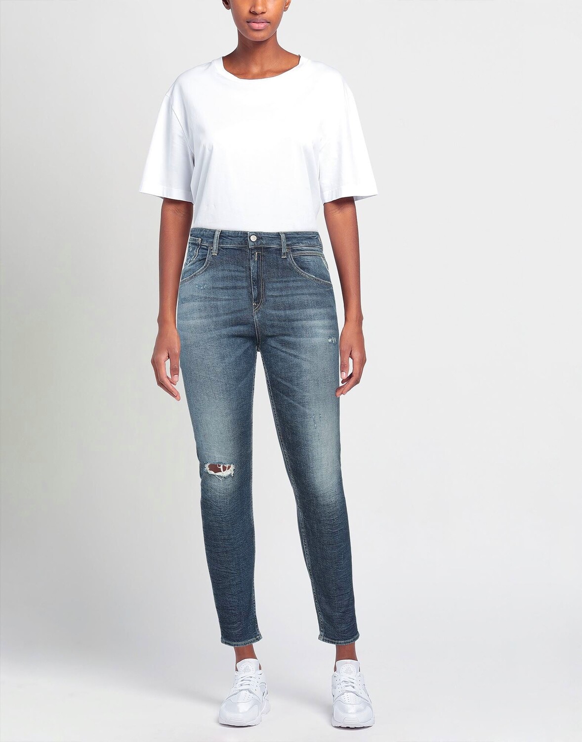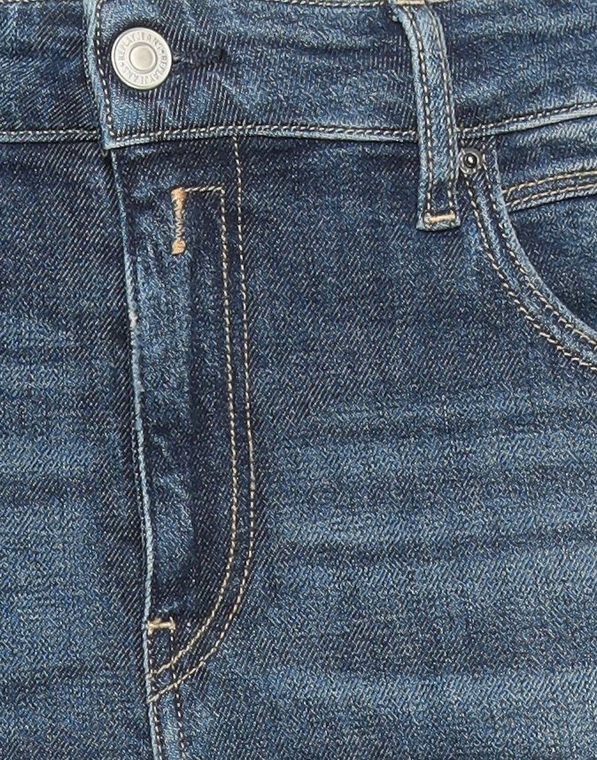 Джинсовая ткань, логотип бренда, одноцветное изделие, темный цвет, завышенная талия, шлевки для ремня, зауженная брючина, стандартная посадка, застежка-молния, пуговицы, несколько карманов, зауженная модель