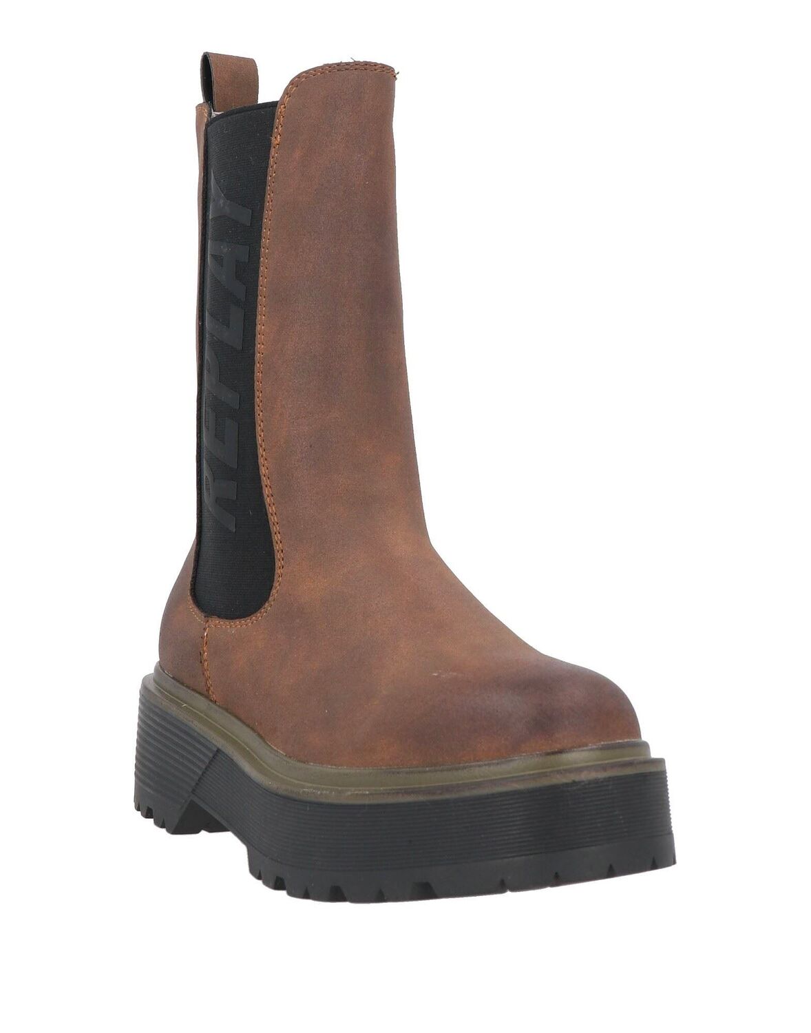 Ткань с покрытием, логотип бренда, одноцветное изделие, внутри на подкладке, эластичные выступы, скругленный носок, квадратный каблук, резиновая подошва, массивные ботинки