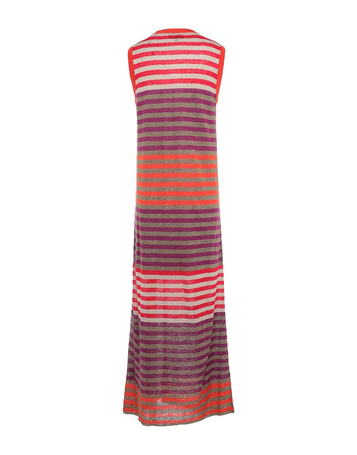 Вязаное, без аппликаций, в полоску, круглый воротник, без рукавов, без карманов, без подкладки.