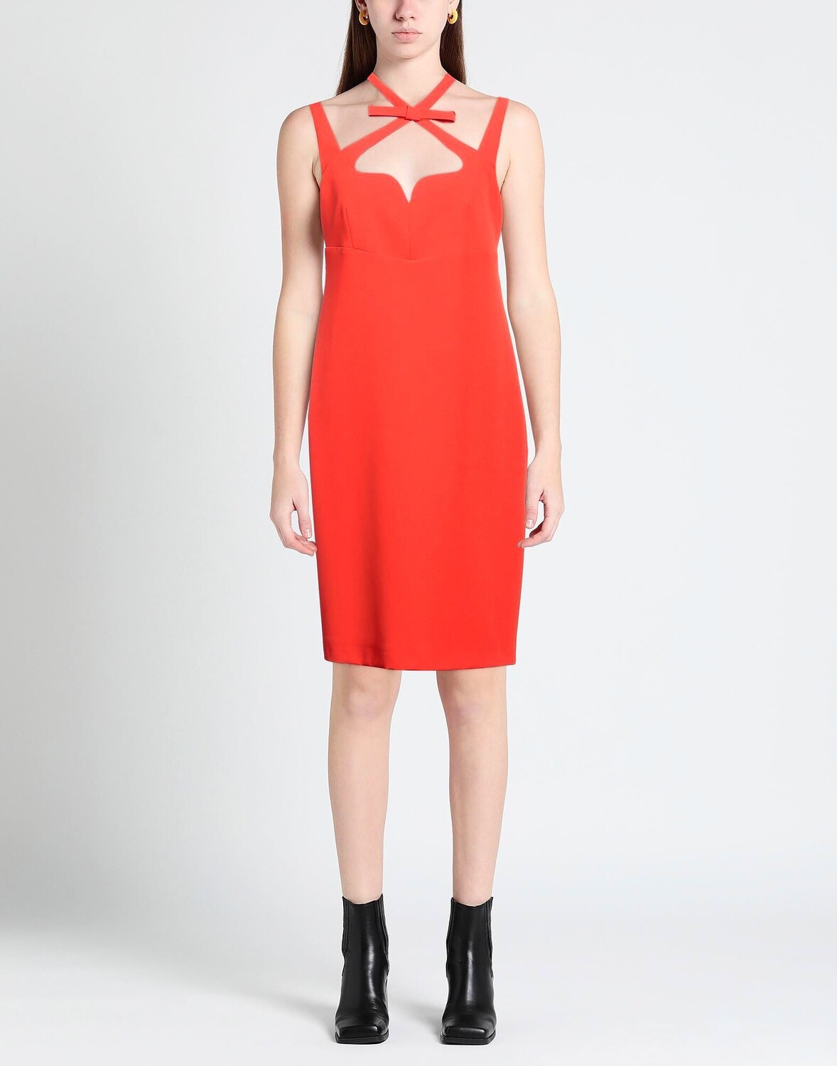 Креп, бантик, одноцветное изделие, глубокий вырез, без рукавов, без подкладки, застежка-молния, без карманов, стрейч, фасон-карандаш