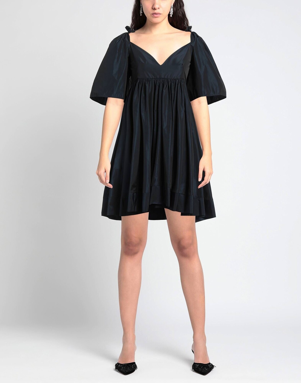 Платье-солнце, тафта, одноцветное изделие, присборено, глубокий вырез, короткие рукава, без подкладки, завязка, множество карманов, машинная стирка или химчистка, нельзя отбеливать, нельзя сушить в стиральной машине