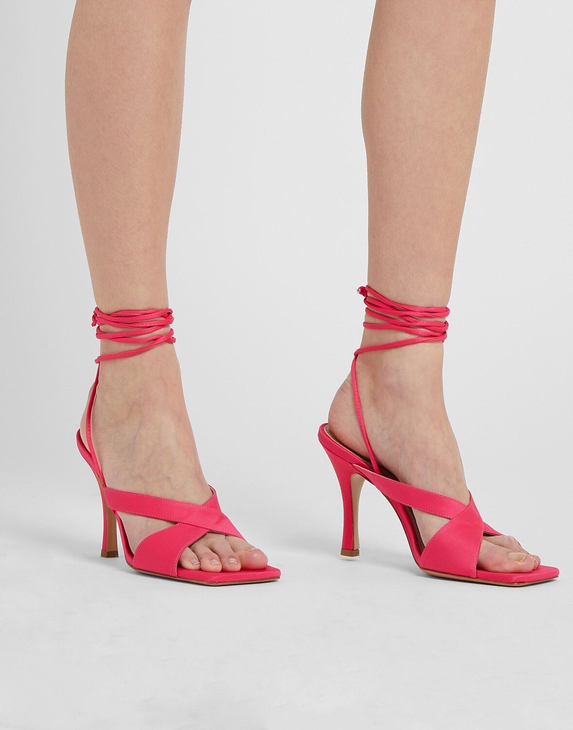 Эти атласные босоножки итальянского производства выделяются квадратным носком и тканой передней частью. Они имеют кожаную подошву и открытую спину, дополнены каблуком-шпилькой и шнурками, завязывающимися на щиколотке. Доступно больше цветов.