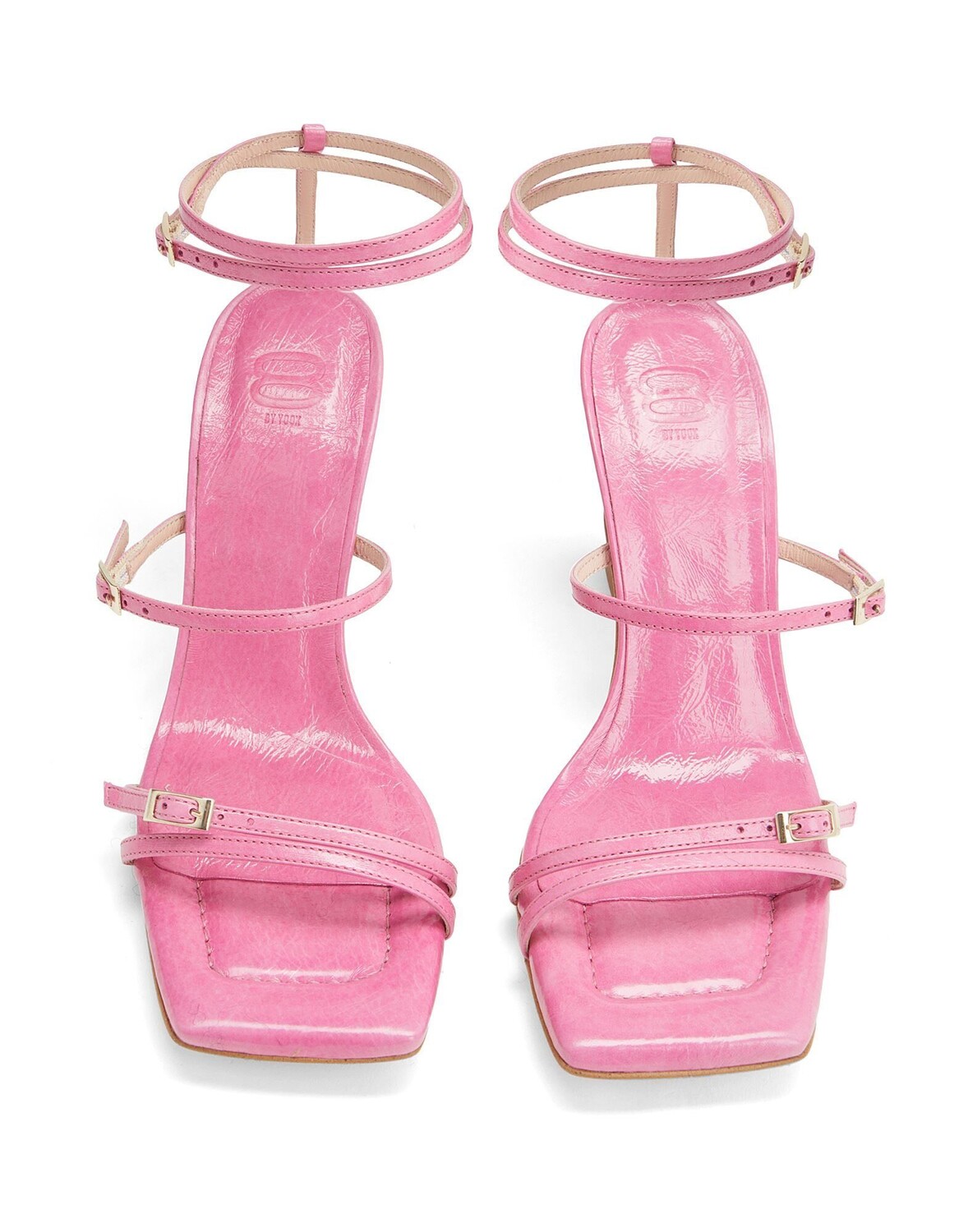 Эти сандалии имеют верх из натуральной кожи с регулируемой пряжкой на высоте щиколотки. Летняя однотонная обувь с квадратным носком, закрытым каблуком в тон и резиновой подошвой.