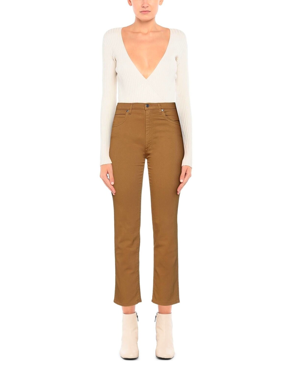 Джинсовая ткань, кожаные аппликации, логотип, однотонное изделие, цветная стирка, высокая талия, пуговицы, молния, множество карманов, стрейч, содержит нетекстильные части животного происхождения