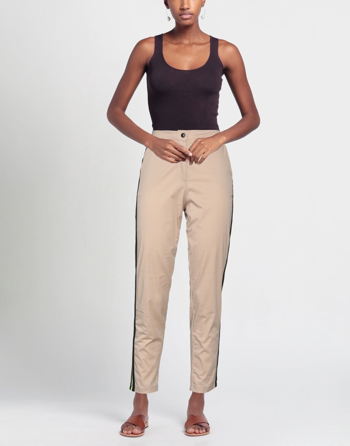 Трикотаж, полотняное переплетение, легкая вязка, полосы по боковым швам, одноцветное изделие с аппликациями, завышенная талия, шлевки для ремня, прямые брючины, стандартный крой, 1 пуговица, застежка-молния, множество карманов, стрейч, брюки чинос