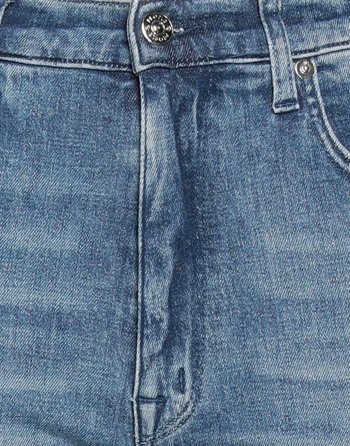 Деним, потертый, кожаные аппликации, логотип бренда, одноцветное изделие, средняя потертость, средняя посадка, расклешенный крой, стандартный крой, с двойными пуговицами, множество карманов, стрейч, содержит нетекстильные части животного происхождения, расклешенный и широкий крой