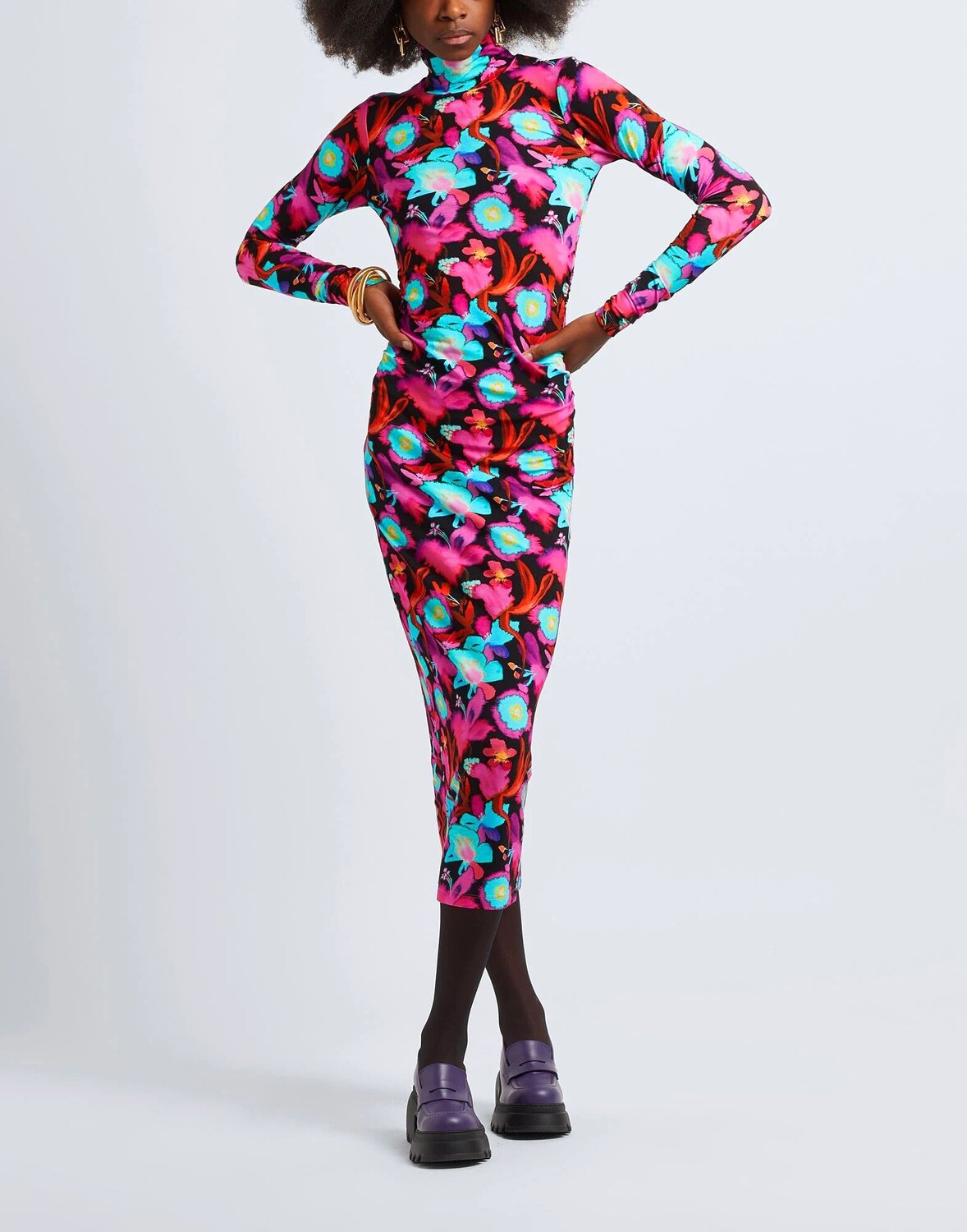Джерси, оборки, цветочный дизайн, водолазка, длинные рукава, без подкладки, стрейч, фасон карандаш
