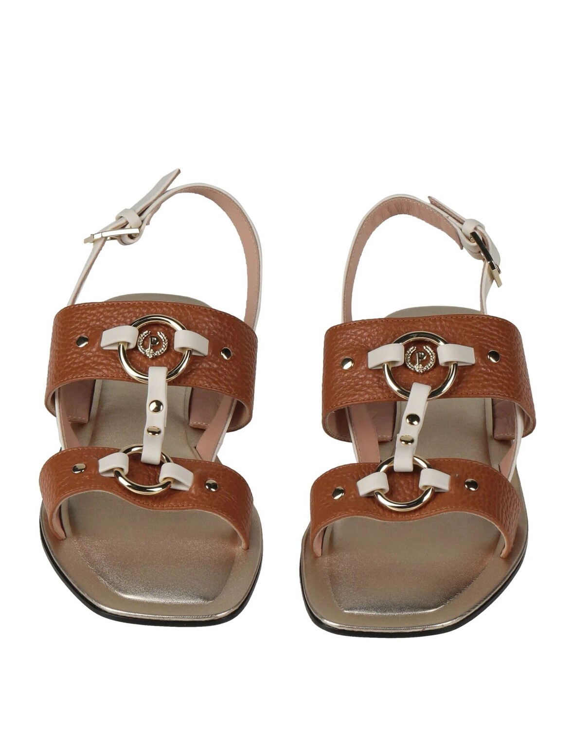 Фактурная кожа, логотип бренда, металлические аппликации, двухцветный вариант, внутри на подкладке, застежка на пряжке, квадратный носок, без каблука, кожаная подошва, содержит нетекстильные части животного происхождения, босоножки с ремешком на щиколотке