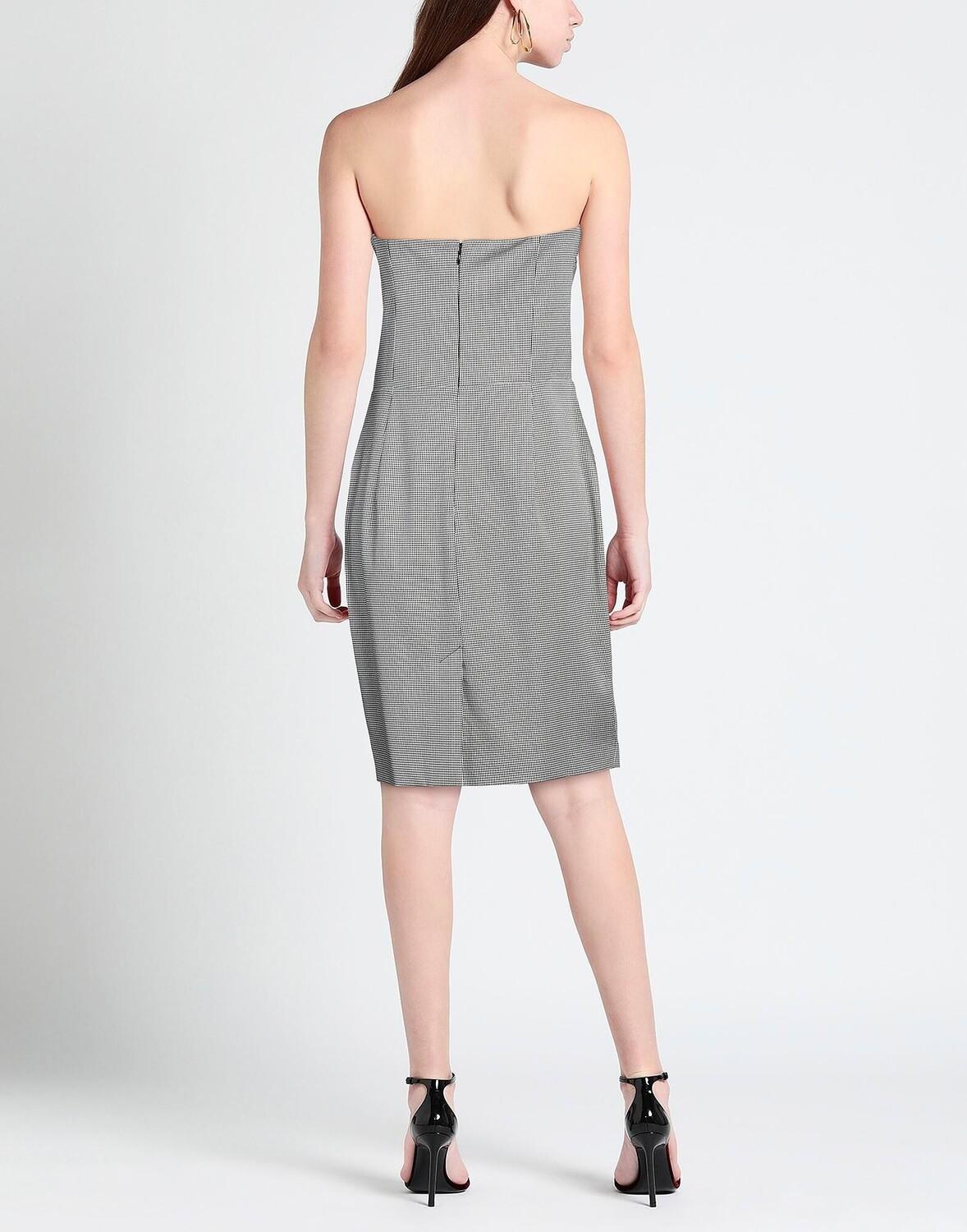 Ткань, логотип бренда, узор «гусиные лапки», глубокий вырез, без рукавов, внутри на подкладке, застежка-молния, без карманов, химчистка, нельзя сушить в стиральной машине, не отбеливать, облегающее платье
