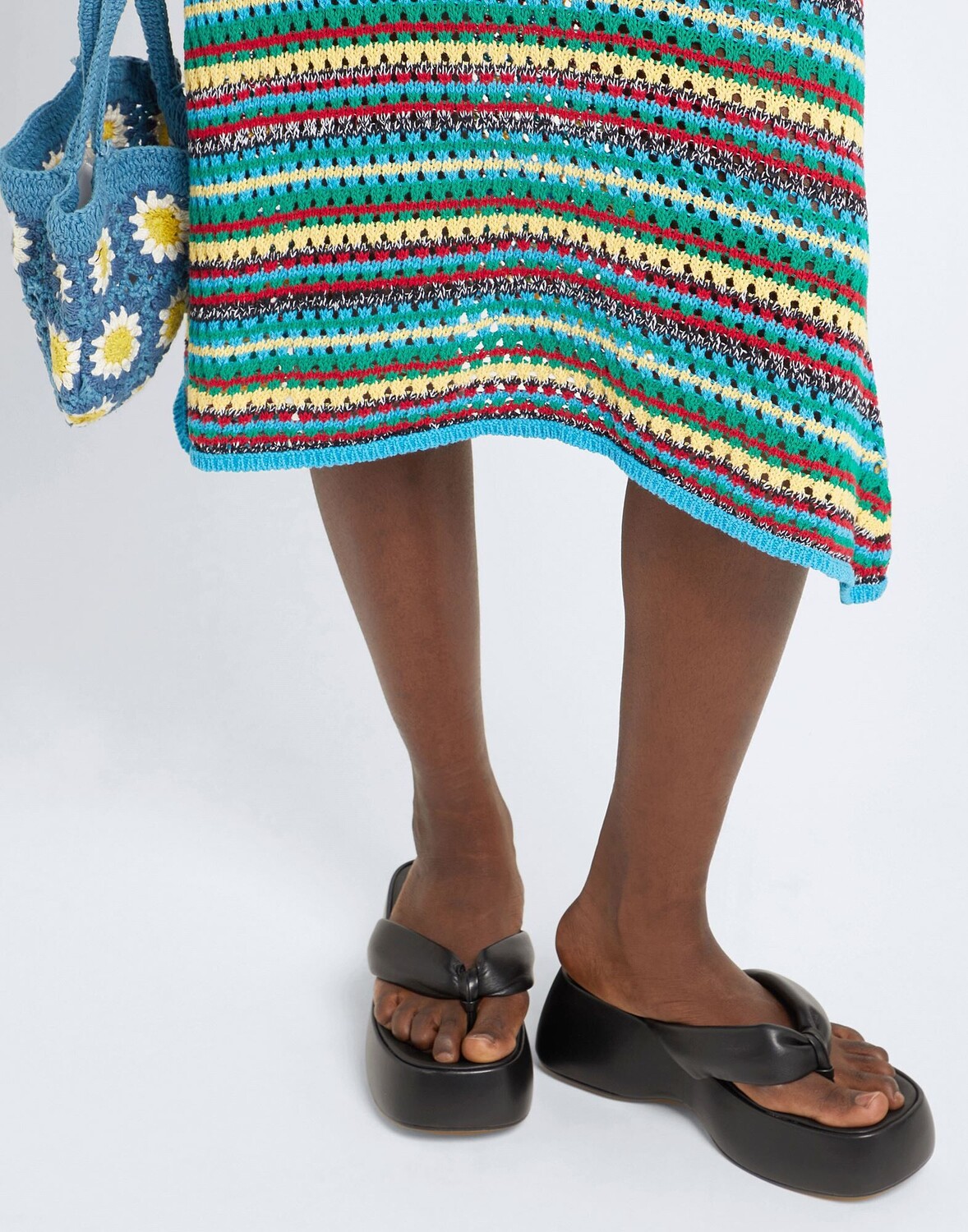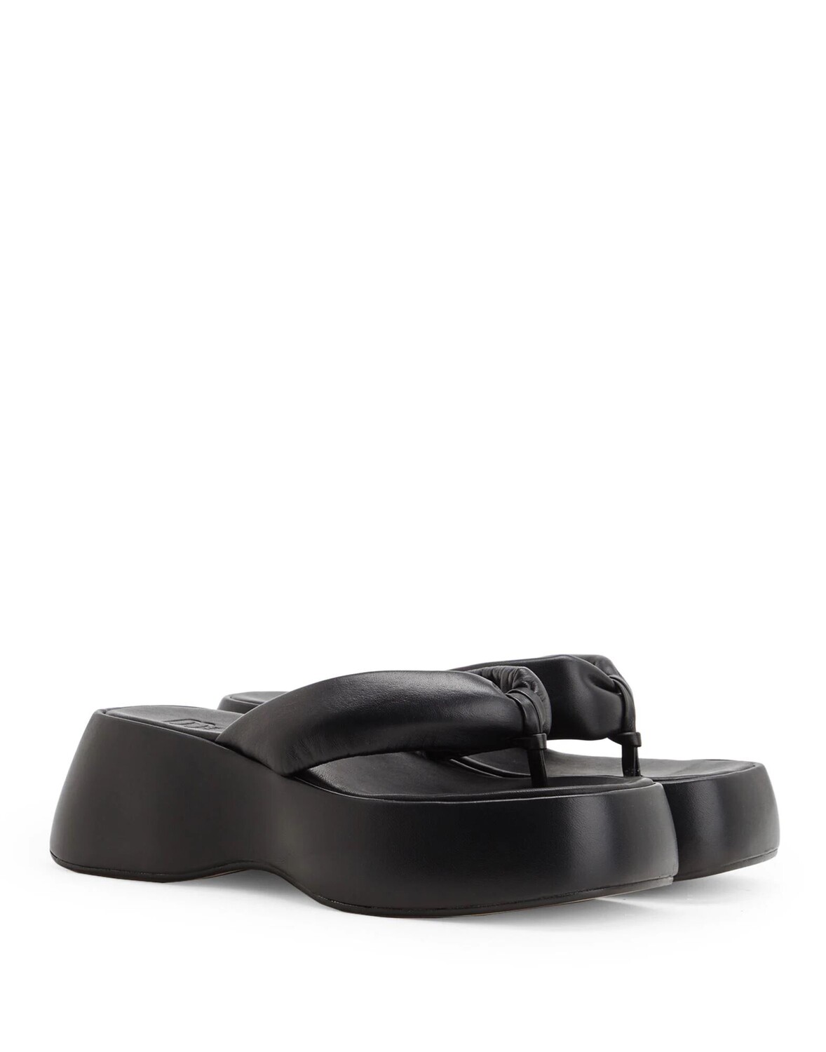 Эти шлепанцы из однотонной кожи имеют квадратный носок. Эта модель, изготовленная в Италии, отличается толстой танкеткой в ​​тон и кожаной подошвой. БОЛЬШЕ УКАЗАННОГО РАЗМЕРА.