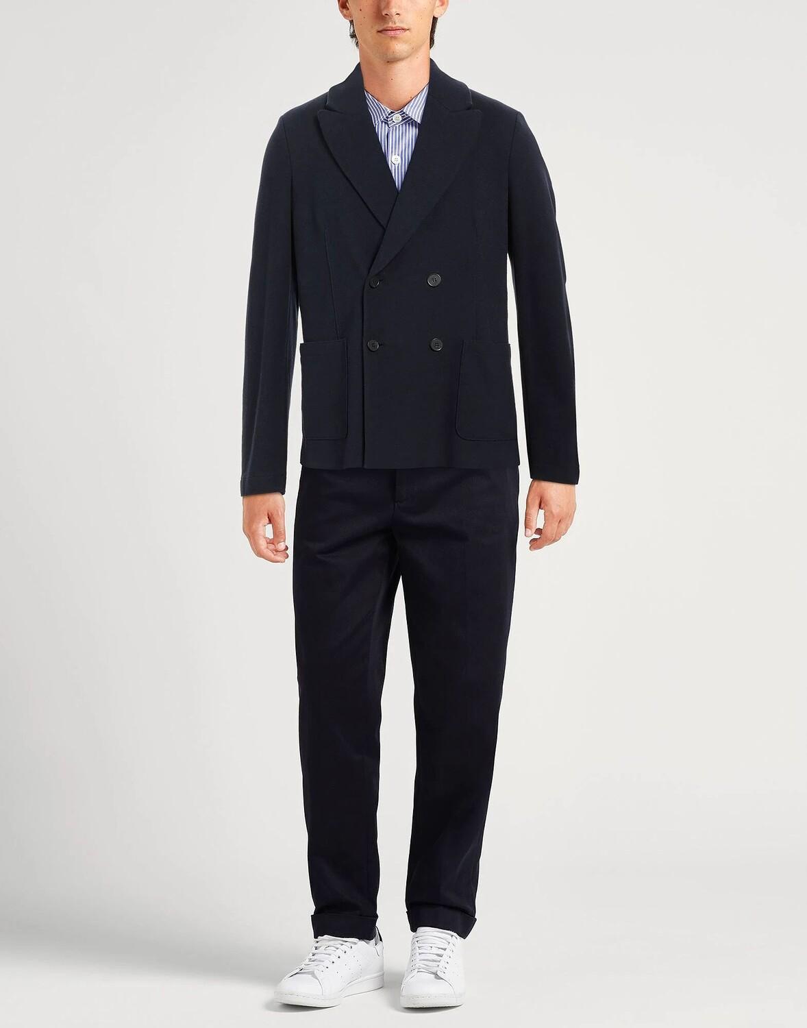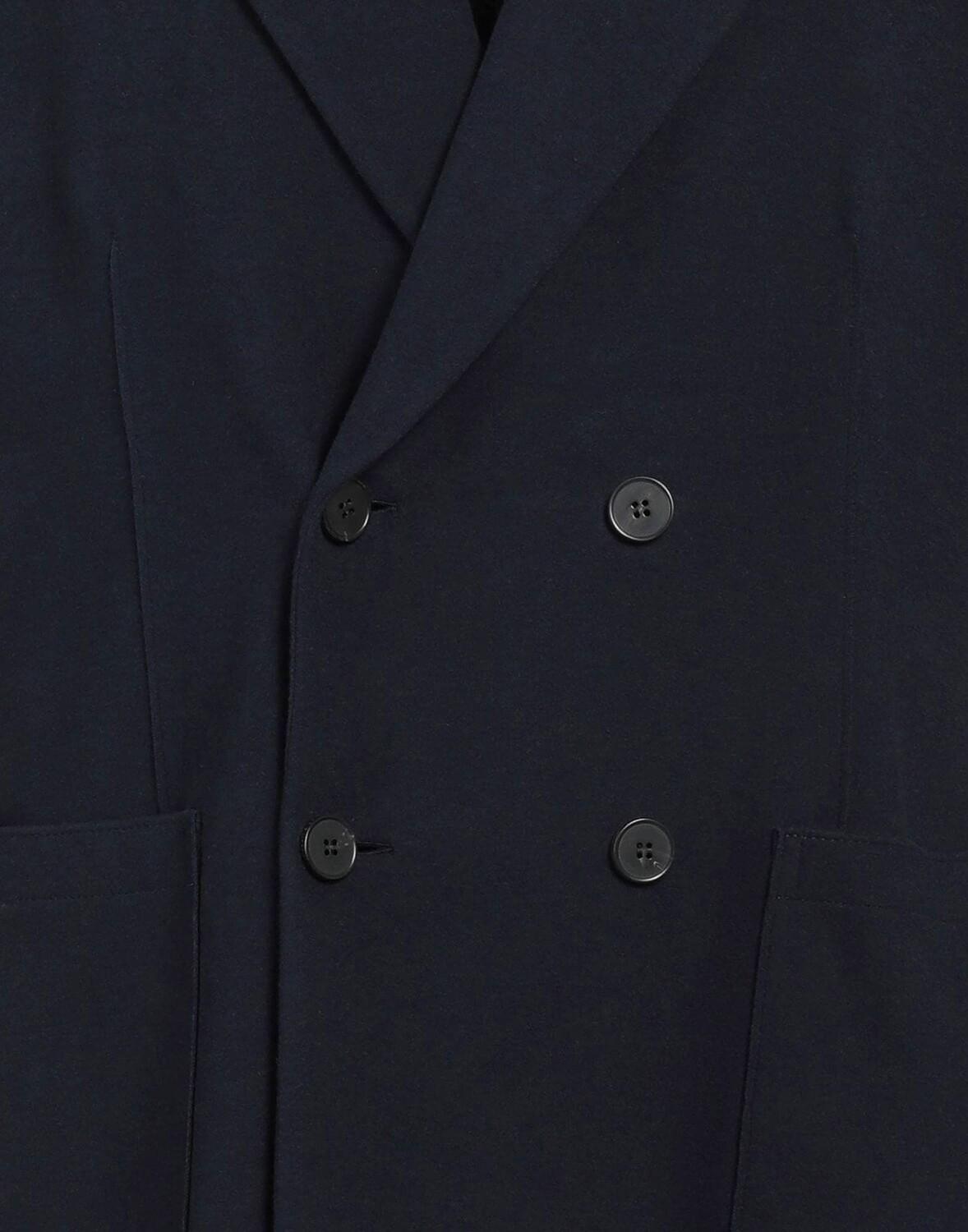 Двубортный пиджак, трикотаж, логотип бренда, одноцветное изделие, воротник с лацканами, длинные рукава, без подкладки, застежка на пуговицы, множество карманов, стрейч, химчистка, нельзя отбеливать, нельзя сушить в стиральной машине, нельзя гладить, маломерный расход этой марки