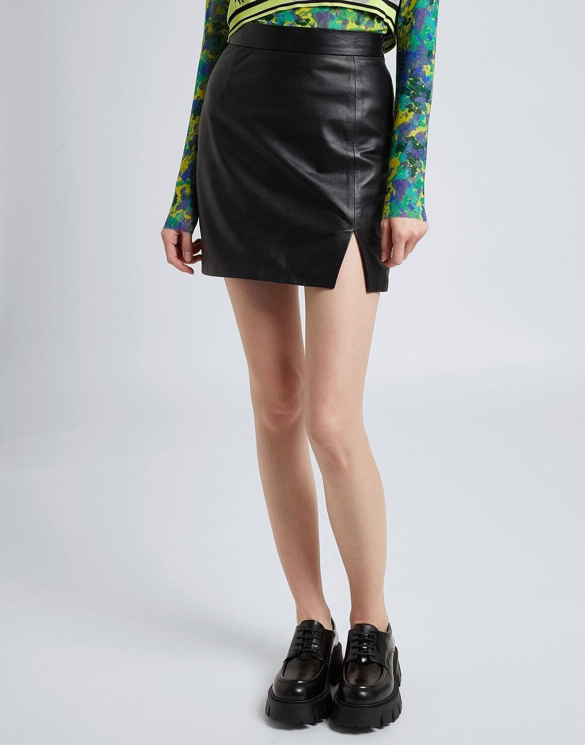 Элегантная мини-юбка из однотонной натуральной кожи с внутренней подкладкой и разрезом внизу. Сделано в Италии, предлагается в слегка расклешенном крое и дополнено застежкой-молнией сзади. На модели итальянский размер S/40. Этот предмет одежды содержит цифровой идентификатор, что означает, что вы можете открыть для себя целый мир эксклюзивного контента о своем изделии; отсканируйте QR-код на этикетке по уходу за товаром.