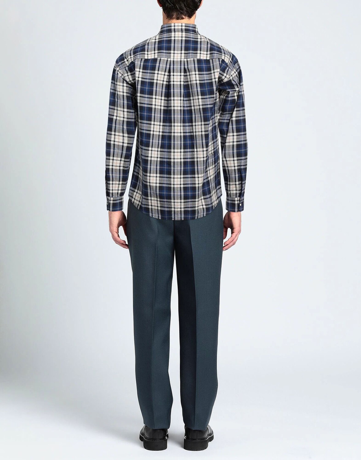Полотняное переплетение, без аппликаций, узор «тартан», классический вырез горловины, длинные рукава, манжеты на кнопках, застежка на кнопки, два нагрудных кармана
