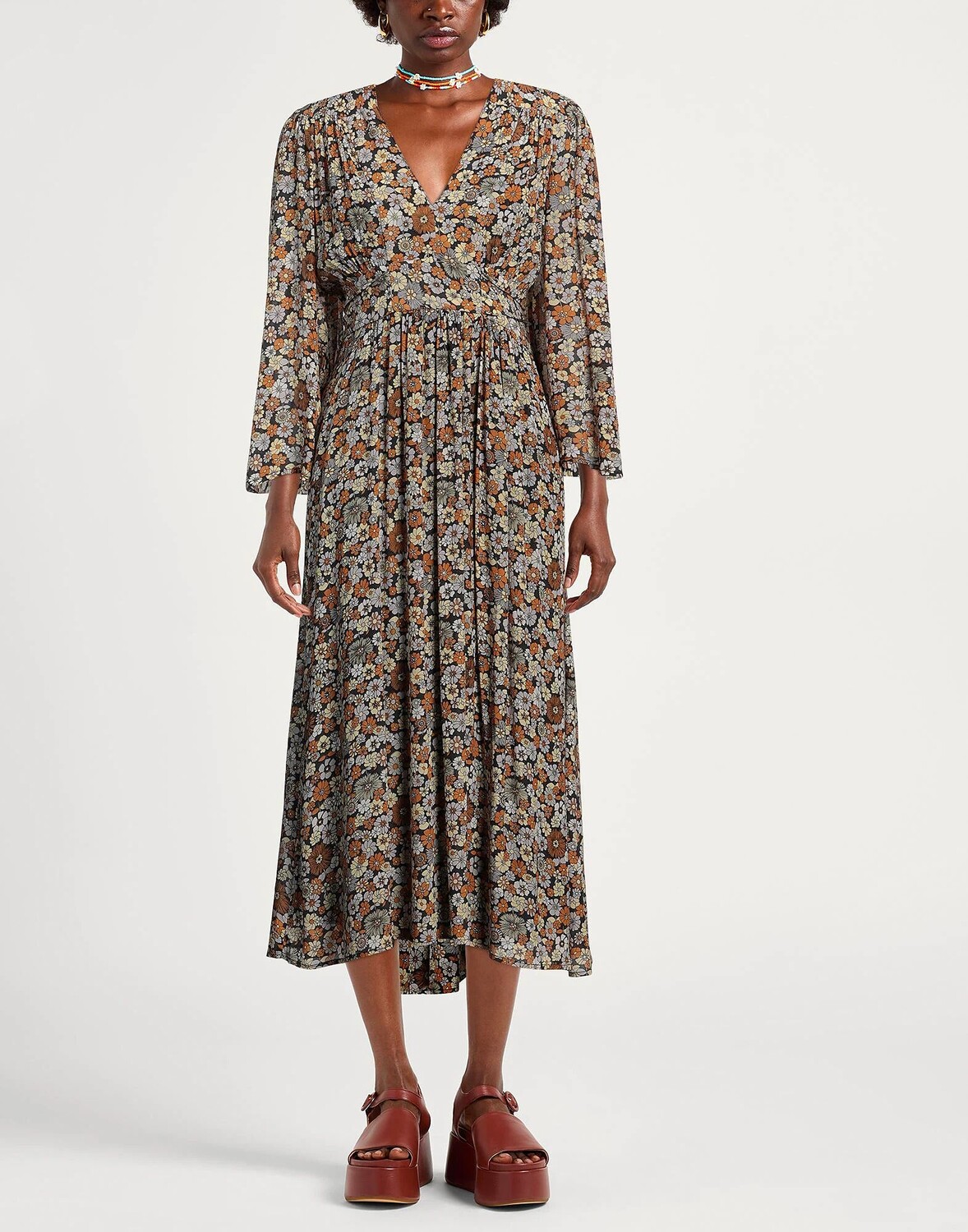 Расклешенное платье, креп, без аппликаций, цветочный принт, v-образный вырез, рукава 3/4, скользящий по силуэту, застежка на завязках, без карманов, ручная стирка или химчистка, не отбеливать, не подвергать машинной сушке