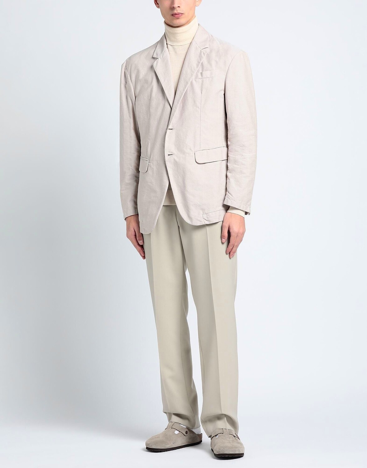Полотняное переплетение, без аппликаций, одноцветное изделие, воротник с лацканами, однобортный, длинные рукава, без подкладки, застежка на пуговицы, множество карманов, двойные шлицы сзади, содержит нетекстильные части животного происхождения, однобортный пиджак