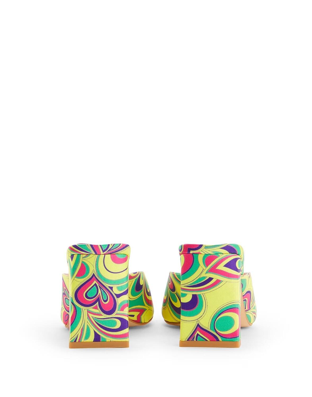 Эти сандалии с квадратным носком, обтянутые атласом и кожаной внутренней частью, характеризуются ремешками. Модель с разноцветным узором дополнена резиновой подошвой и каблуком геометрической формы.