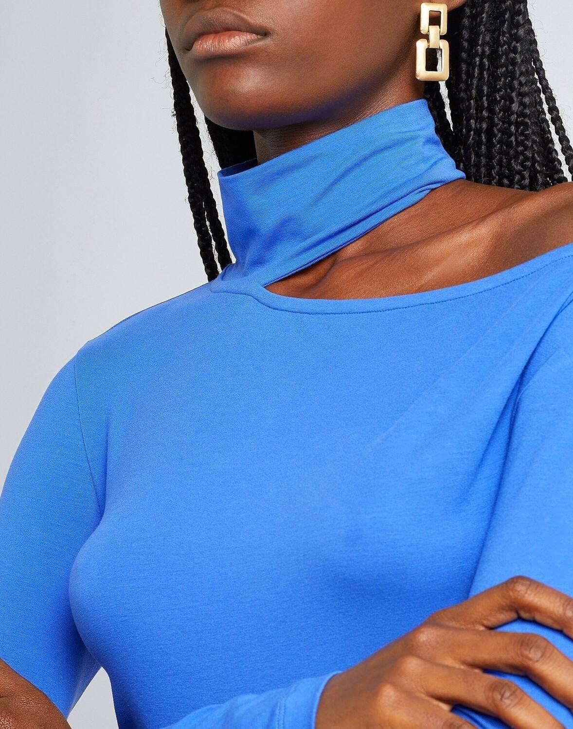 Эта футболка из однотонного эластичного джерси приобретает уникальный вид благодаря вырезу на плече. Модель выполнена с высоким воротником и предлагается в версии с длинными рукавами. На модели итальянский размер S/40. Этот предмет одежды содержит цифровой идентификатор, что означает, что вы можете открыть для себя целый мир эксклюзивного контента о своем изделии; отсканируйте QR-код на этикетке по уходу за товаром.