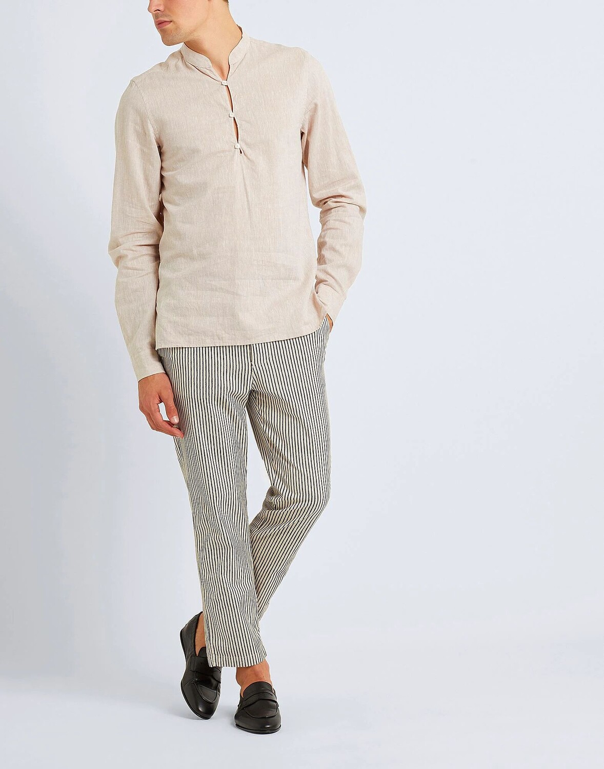 Эта рубашка с длинными рукавами изготовлена ​​в Италии из хлопка и льна и имеет воротник-стойку. Доступен в однотонном цвете, отличается застежкой на три пуговицы спереди и боковыми разрезами на подоле. Рост модели 6 футов 2 дюйма/190 см, она носит итальянский размер М-48.