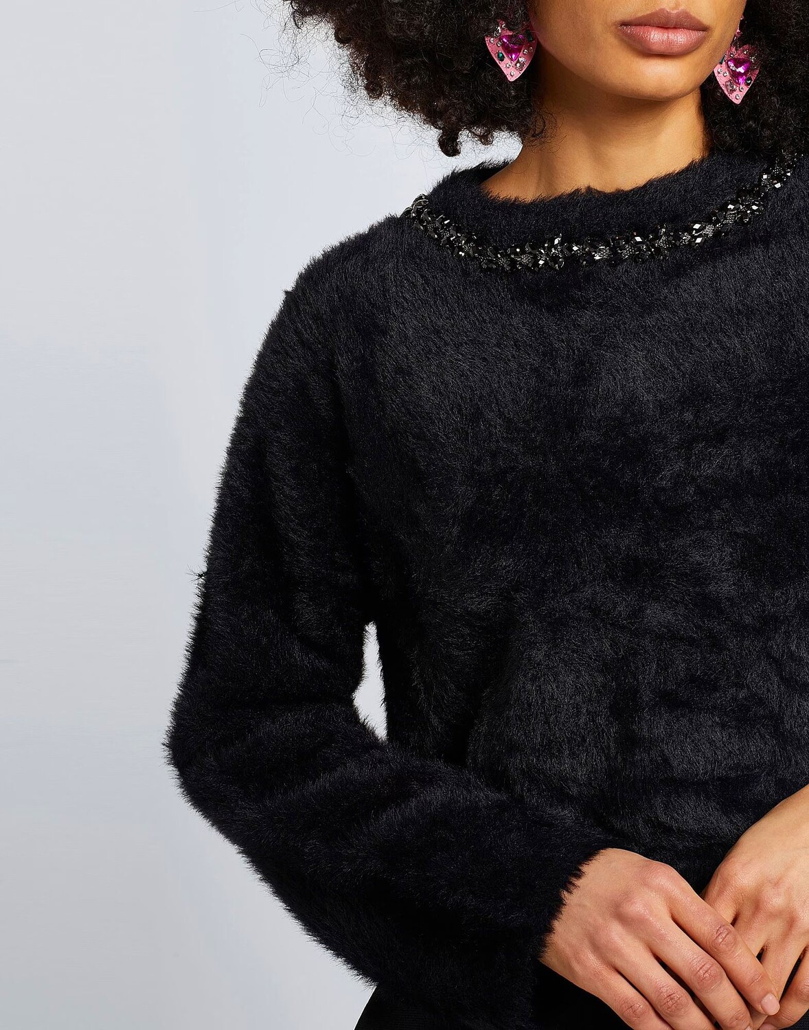 Этот свитер с длинными рукавами украшен стразами на вырезе. Сделано в Италии и представлено в однотонном цвете, оно выделяется круглым вырезом и легкой текстурой. Модель одета в итальянский размер S/40. Этот предмет одежды содержит цифровой идентификатор, что означает, что вы можете открыть для себя целый мир эксклюзивного контента о своем изделии; отсканируйте QR-код на этикетке по уходу за товаром.