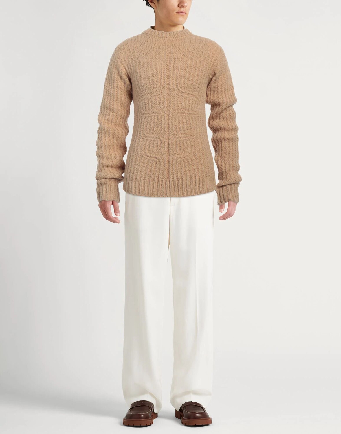 Трикотаж, средней плотности, логотип бренда, одноцветное изделие, круглый вырез, длинные рукава, без карманов, содержит нетекстильные части животного происхождения, химчистка, нельзя отбеливать, нельзя сушить в стиральной машине, предназначен для свободного кроя
