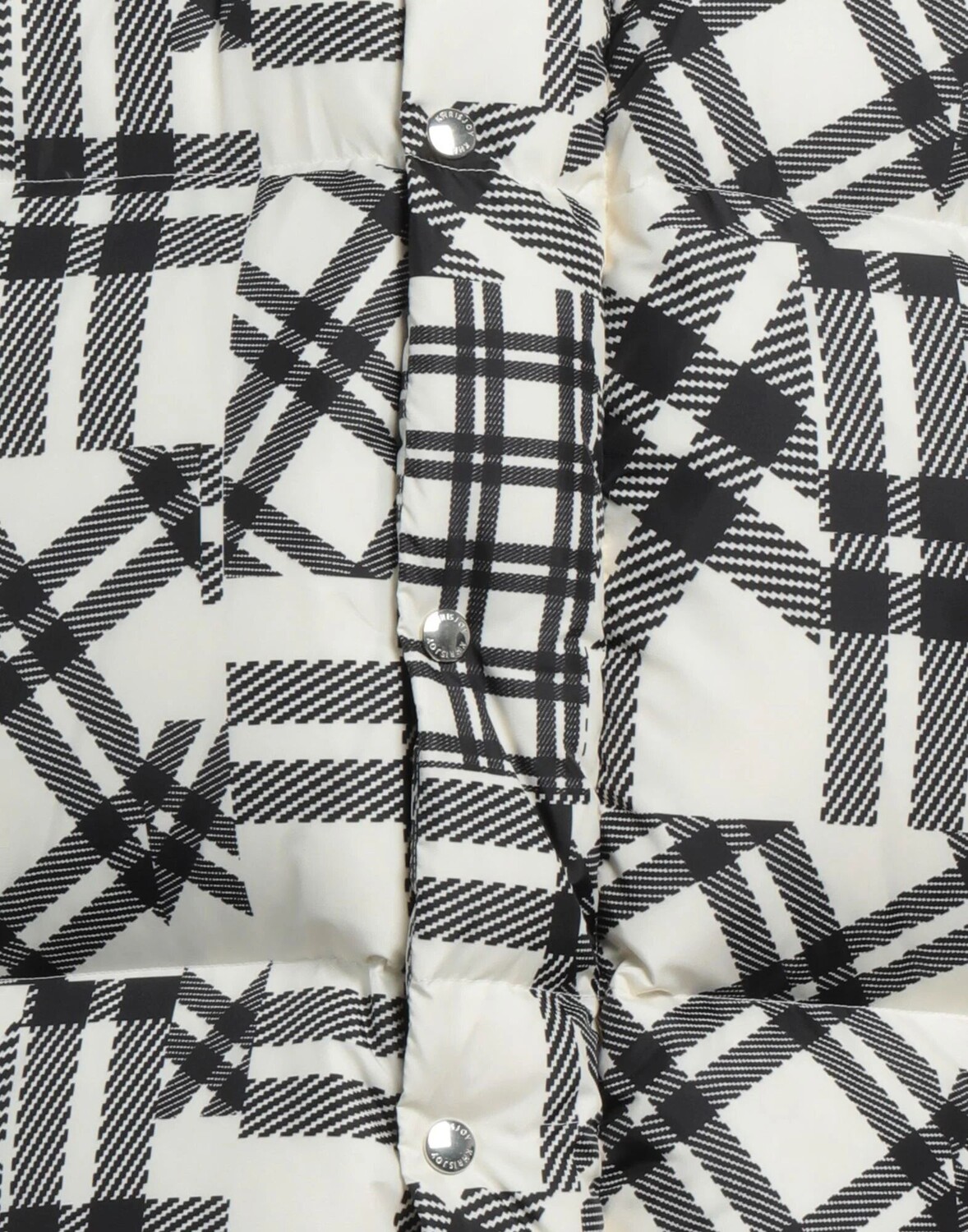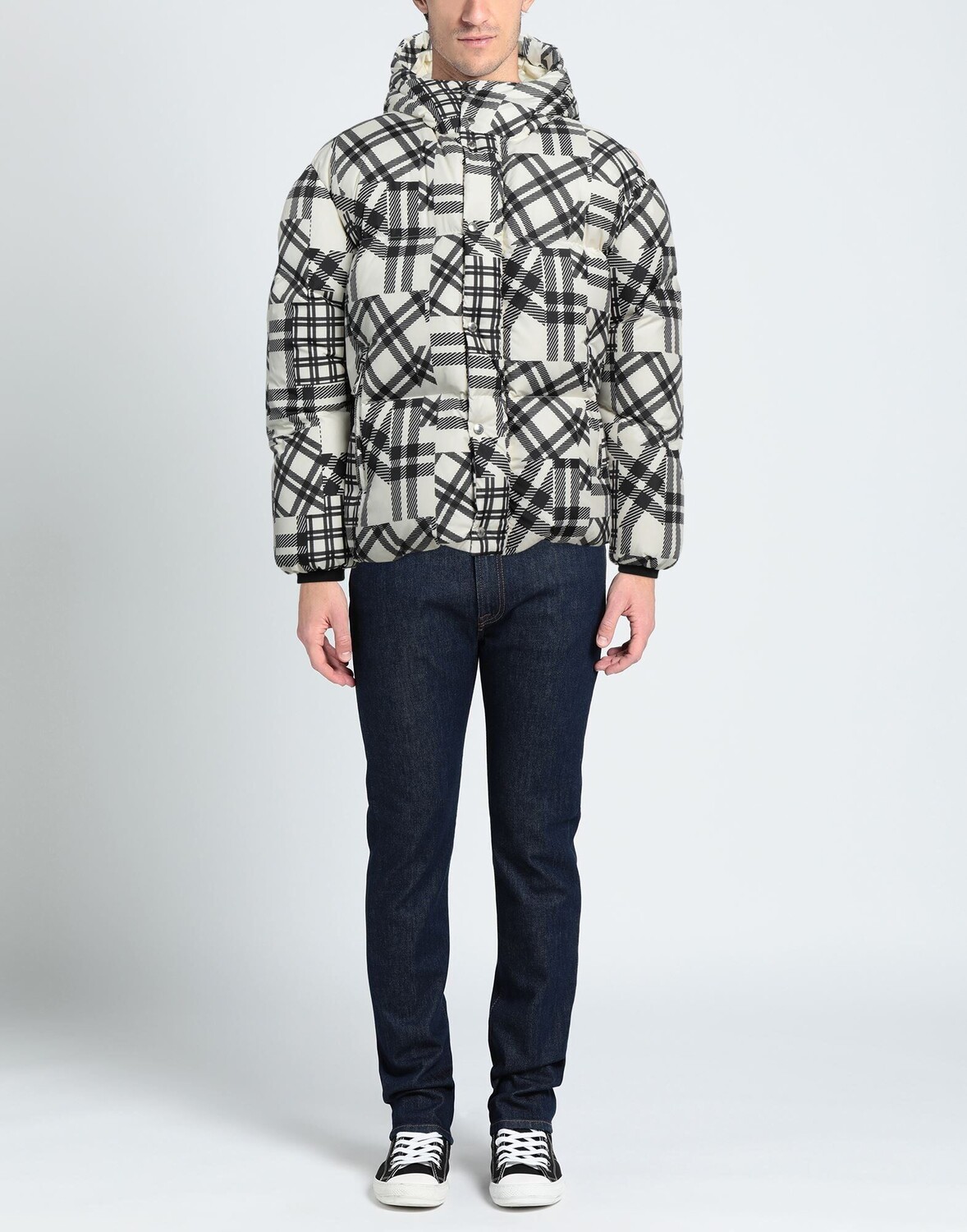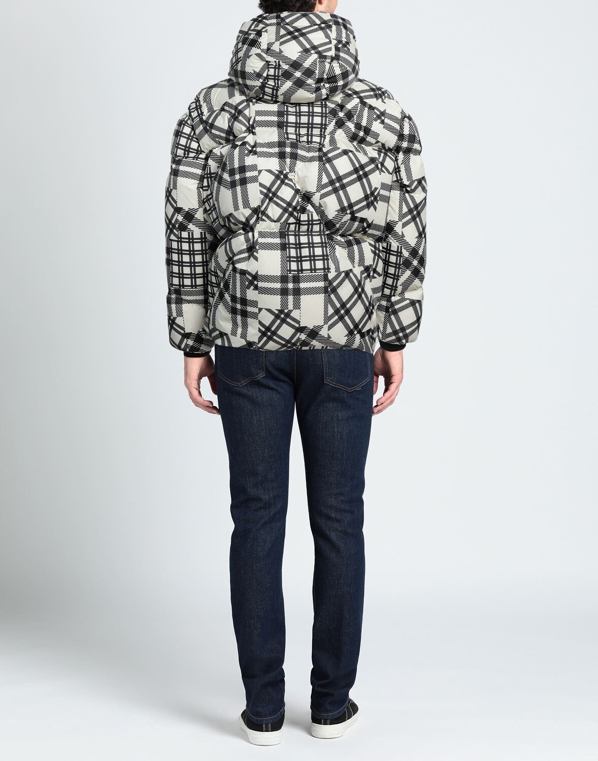 Техническая ткань, без аппликаций, узор «тартан», воротник с капюшоном, однобортный, длинные рукава, внутренняя часть из гусиного пуха, застежка-молния, множество карманов, содержит нетекстильные части животного происхождения, однобортный пиджак