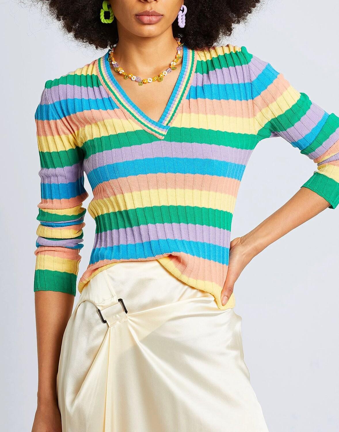 Вязаный, легкий трикотаж, без аппликаций, полосок, V-образный вырез, длинные рукава, без карманов. Этот предмет одежды содержит цифровой идентификатор, что означает, что вы можете открыть для себя целый мир эксклюзивного контента о своем изделии; отсканируйте QR-код на этикетке по уходу за товаром.