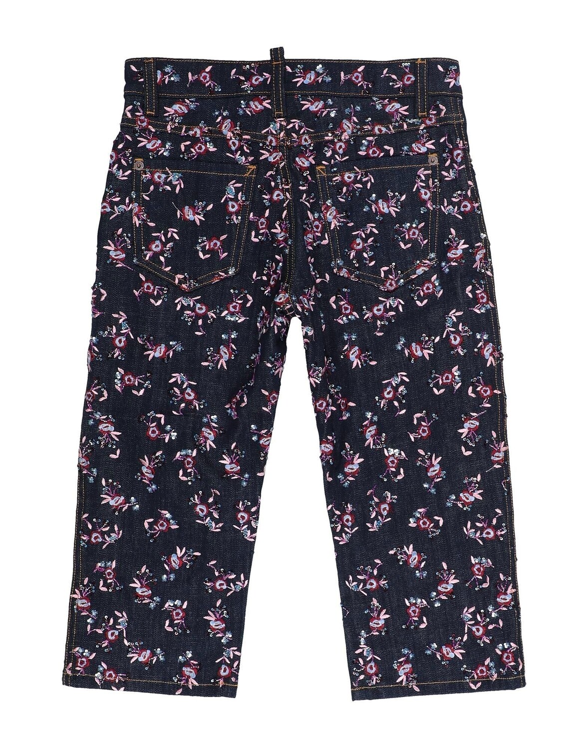 Джинсовая ткань, вышивка, пайетки, темная ткань, цветочный дизайн, пять карманов, 3 пуговицы, ручная стирка, не подвергать химчистке, не использовать машинную сушку, не гладить, не отбеливать, средняя посадка, стрейч