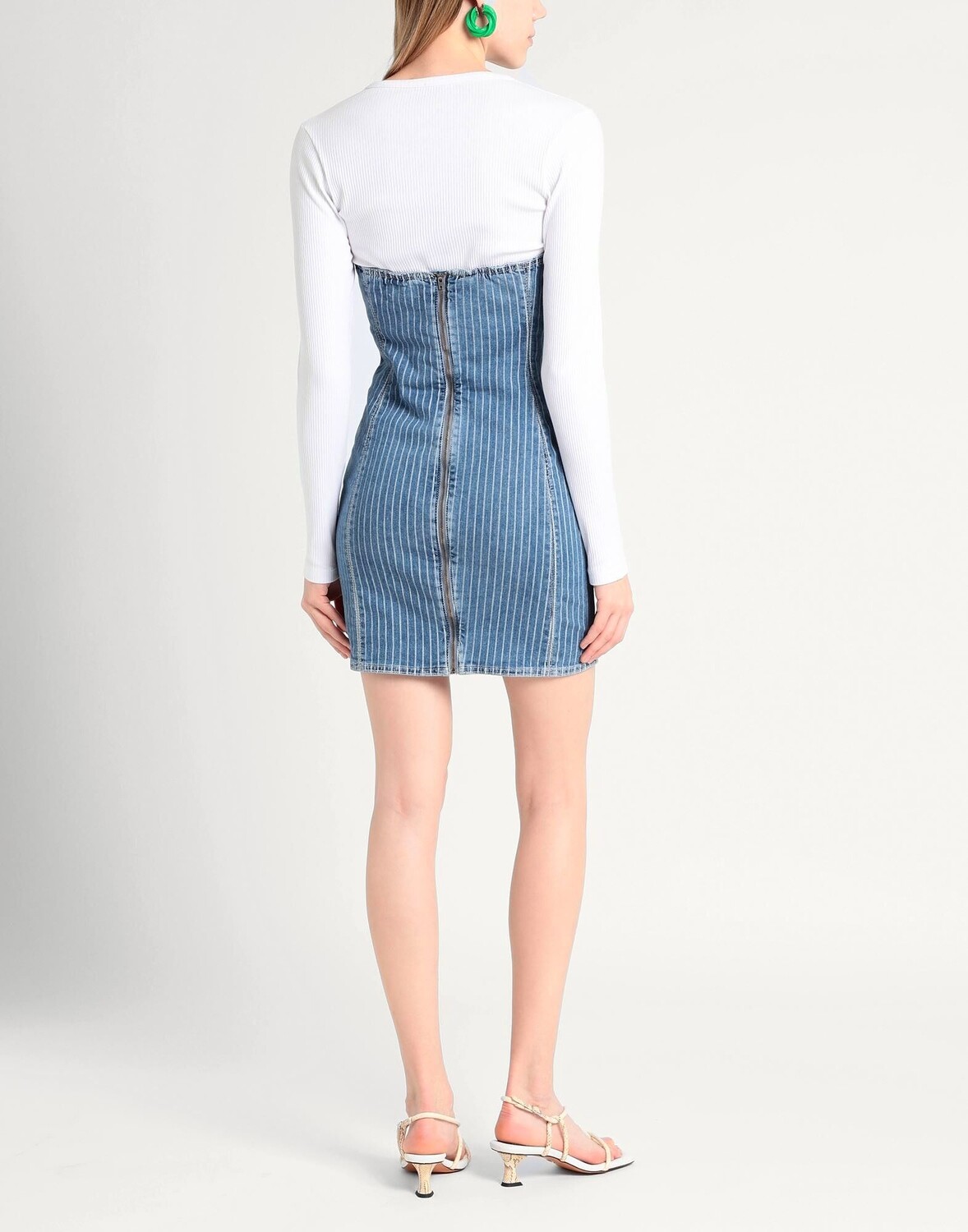 Джинсовая ткань, без аппликаций, в полоску, вырез сердечком, средняя стирка, без рукавов, без подкладки, застежка-молния, без карманов, стрейч, машинная стирка или химчистка, не отбеливать, сушить в стиральной машине, облегающее платье