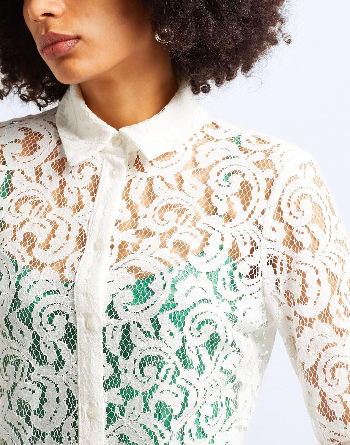 Эта кружевная рубашка итальянского производства изготовлена ​​из смеси хлопка и отличается своей женственностью и элегантностью. Модель с длинными рукавами, классическим воротником, застегивается на планку на пуговицах и манжеты на пуговицах. На модели итальянский размер S/40. Этот предмет одежды содержит цифровой идентификатор, что означает, что вы можете открыть для себя целый мир эксклюзивного контента о своем изделии; отсканируйте QR-код на этикетке по уходу за товаром.