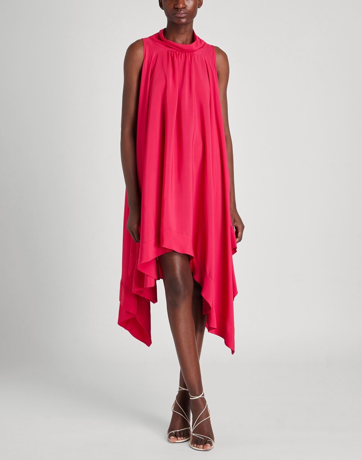 Креп, без аппликаций, одноцветное изделие, круглый вырез, без рукавов, без подкладки, без карманов, асимметричное платье