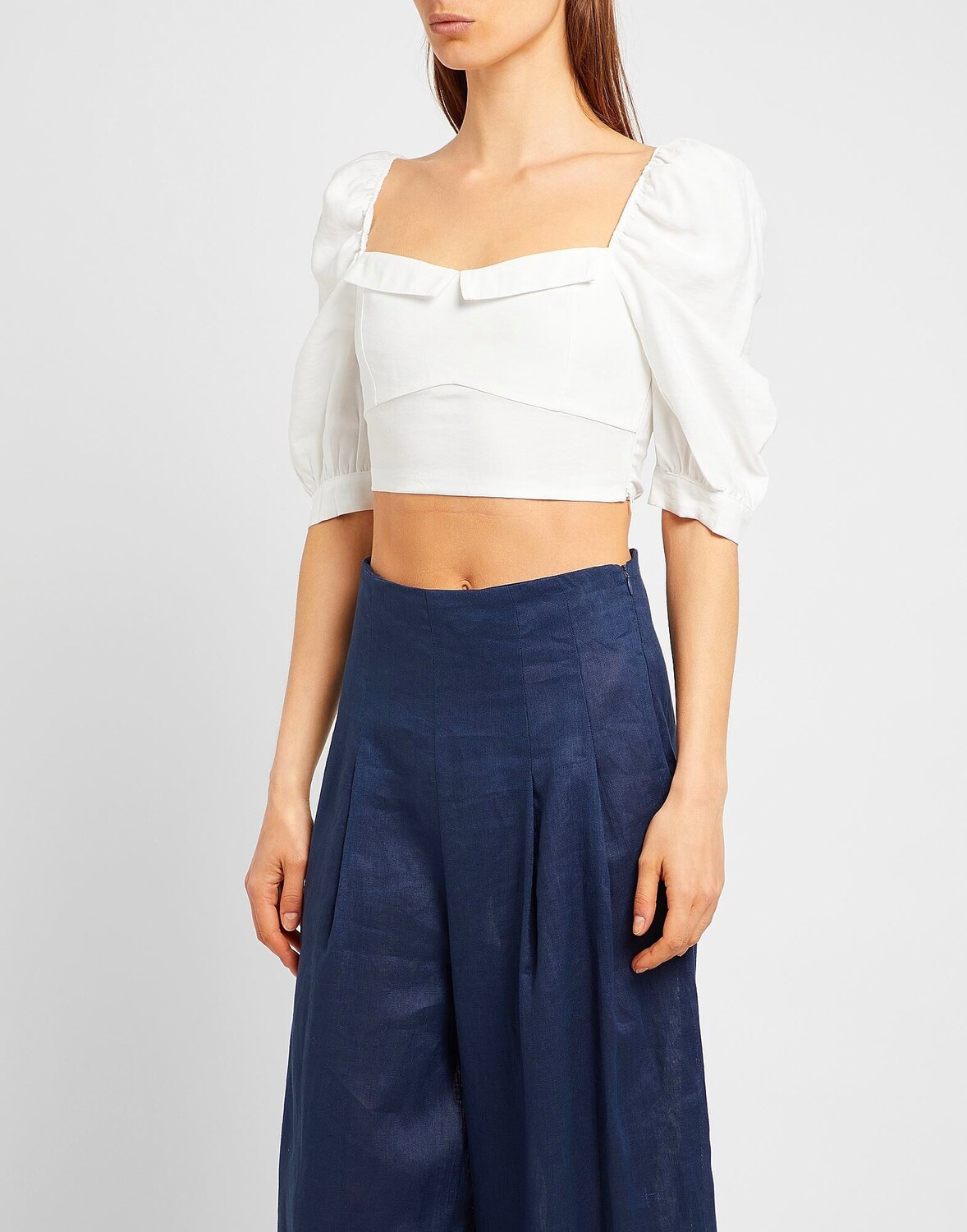 Итальянская блузка с короткими рукавами-фонариками, украшенная пуговицей с драгоценными камнями на манжете. Однотонное изделие с укороченным кроем, квадратным вырезом, сборкой сзади и практичной боковой застежкой-молнией. Рост модели 178 см (5 футов 10 дюймов), на ней итальянский размер S-40.
