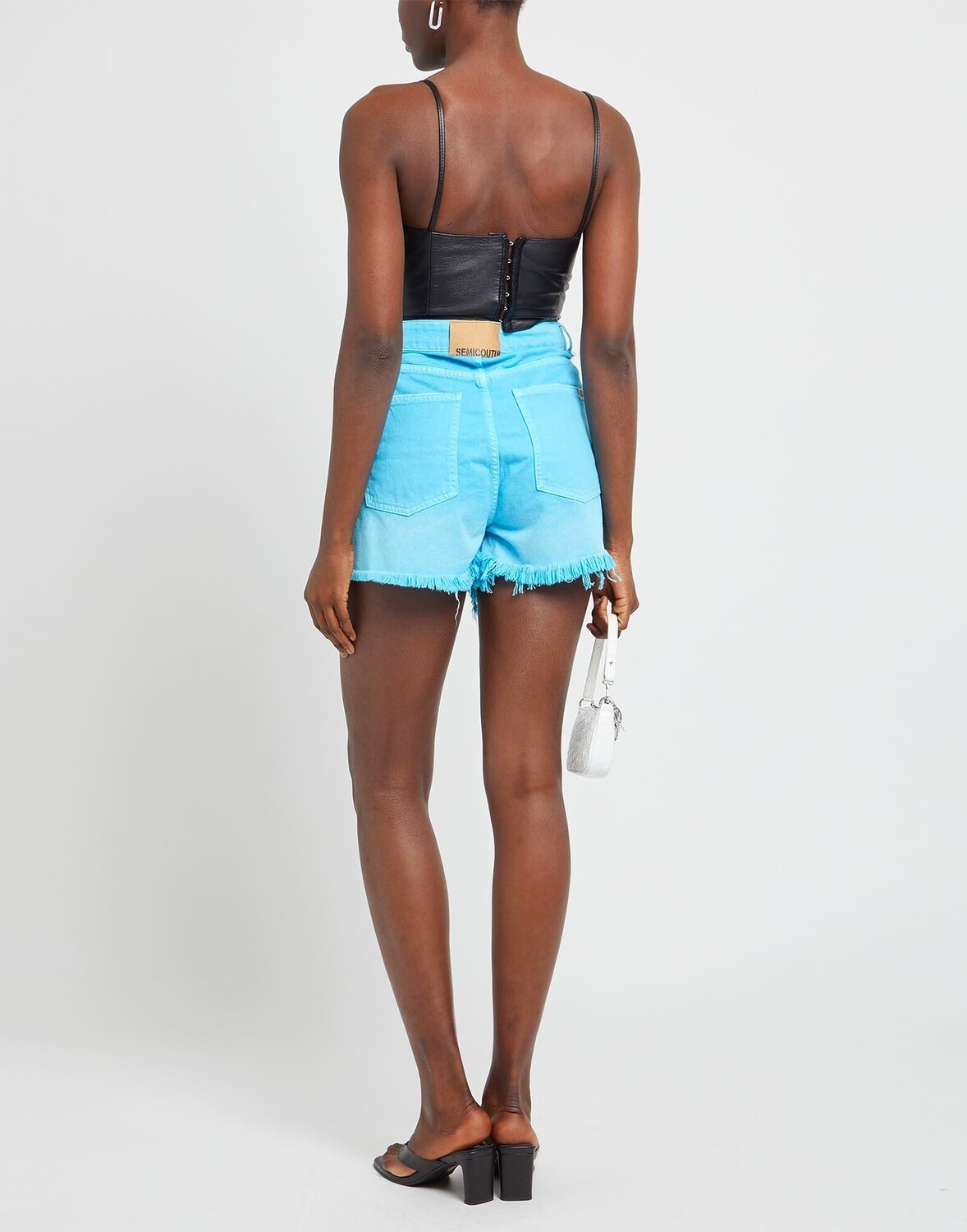 Джинсовая ткань, логотип бренда, одноцветное изделие, цветная стирка, завышенная талия, шлевки для ремня, стандартный крой, застежка-молния, 1 пуговица, подол с бахромой, шорты