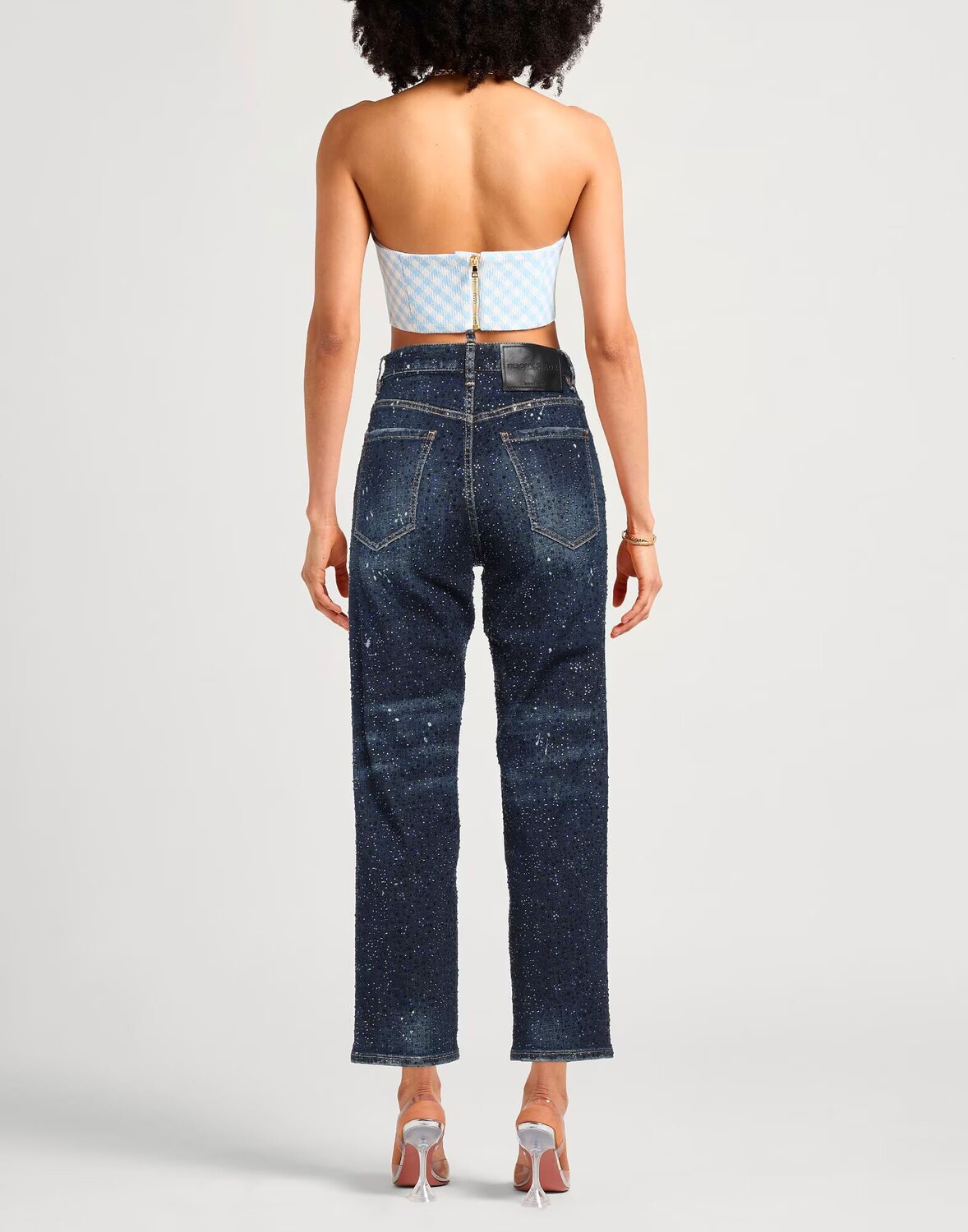 Прямые джинсы, деним, потертости, логотип бренда, стразы, кожаная отделка, окрашенные в тай-дах, темная стирка, высокая талия, стандартный крой, застежка на пуговицы, множество карманов, ручная стирка или химчистка, не отбеливать, не сушить в стиральной машине, содержит нетекстильные части животного происхождения