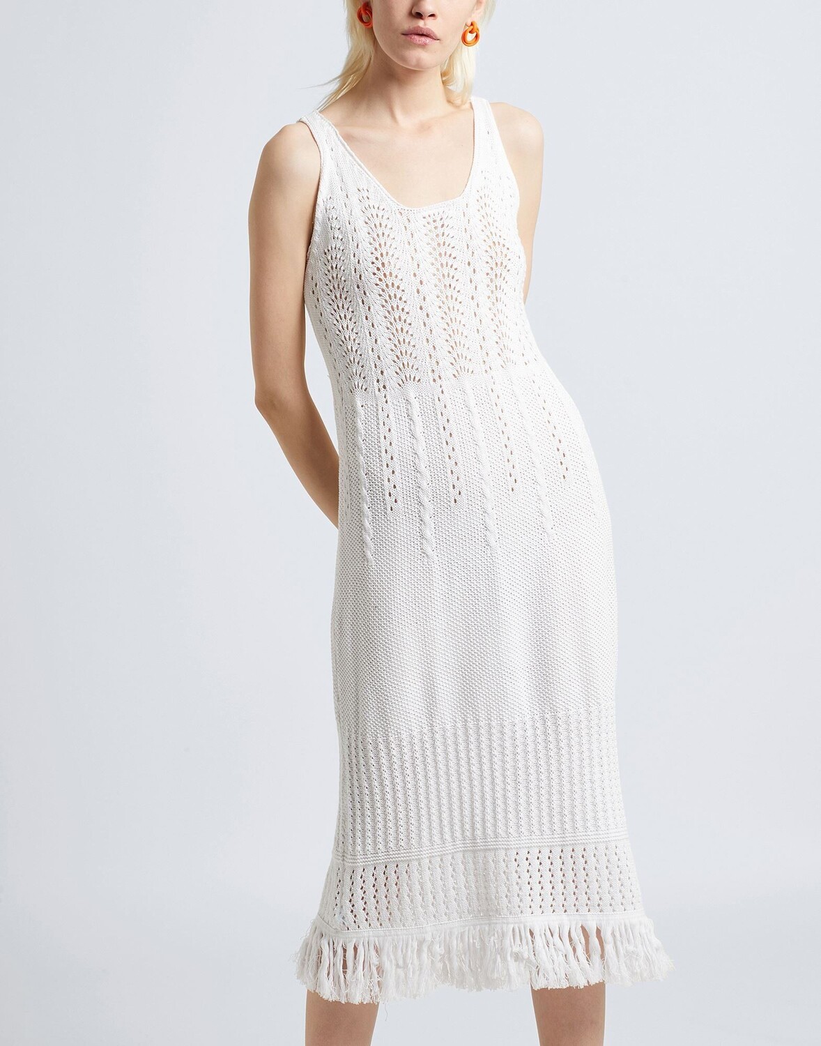 Трикотажное, ажурное, легкая вязка, без аппликаций, однотонное, круглый воротник, без рукавов, без подкладки, подол с бахромой, платье. Это изделие содержит цифровой идентификатор, что означает, что вы можете открыть для себя мир эксклюзивного контента о своем изделии; отсканируйте QR-код на этикетке по уходу за товаром.