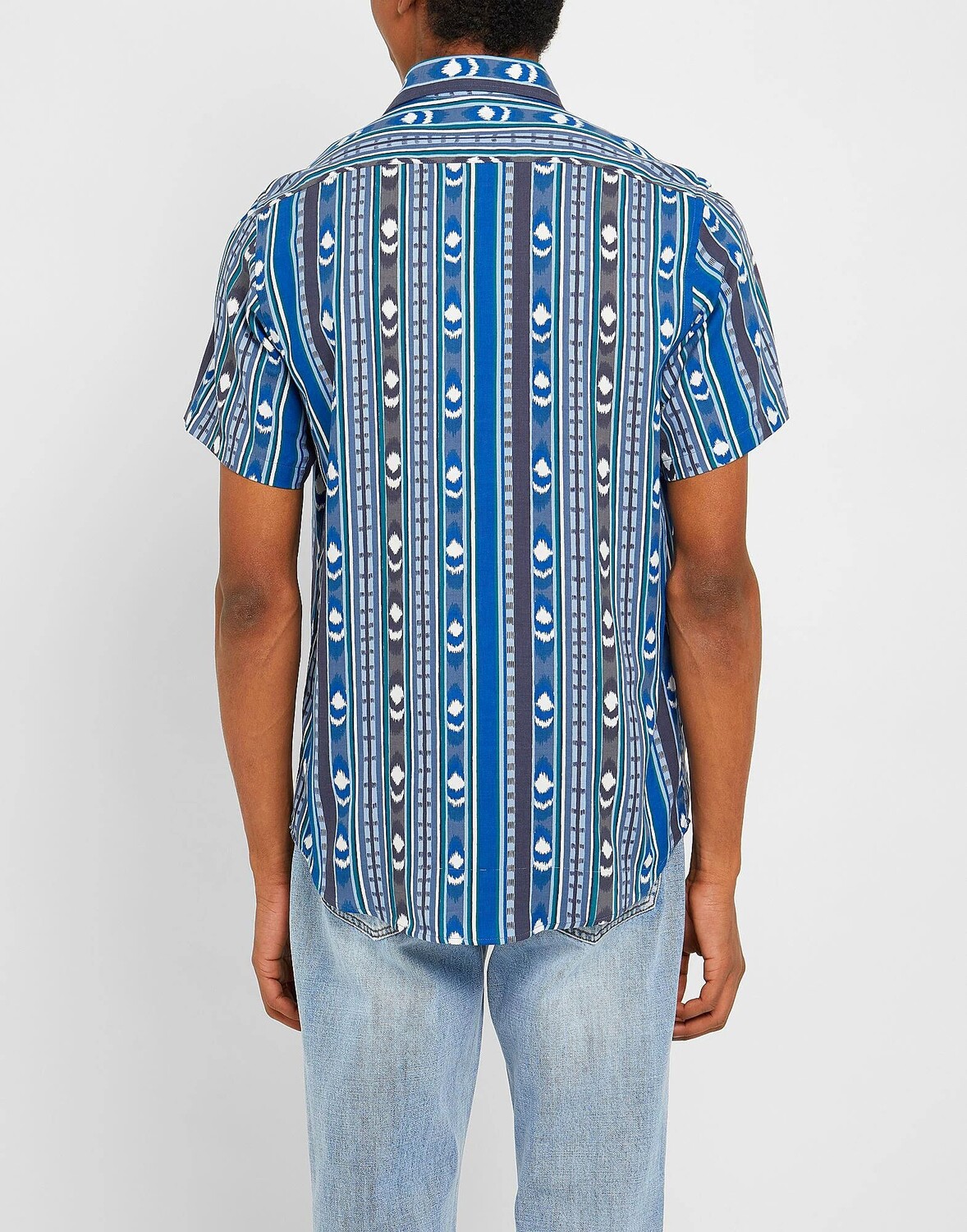 Полотняное плетение, без аппликаций, разноцветный узор, застежка спереди, пуговицы, короткие рукава, классический вырез горловины, без карманов