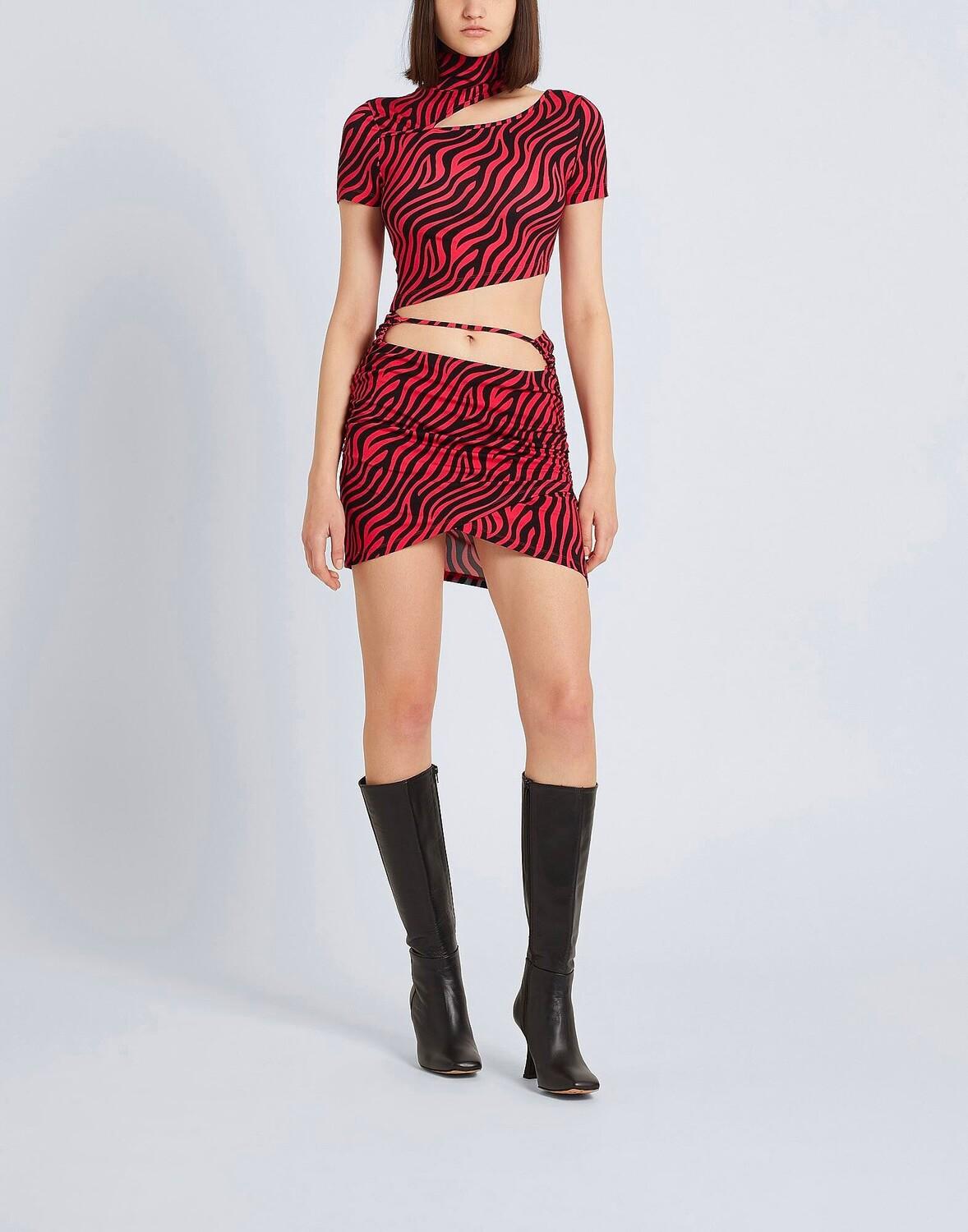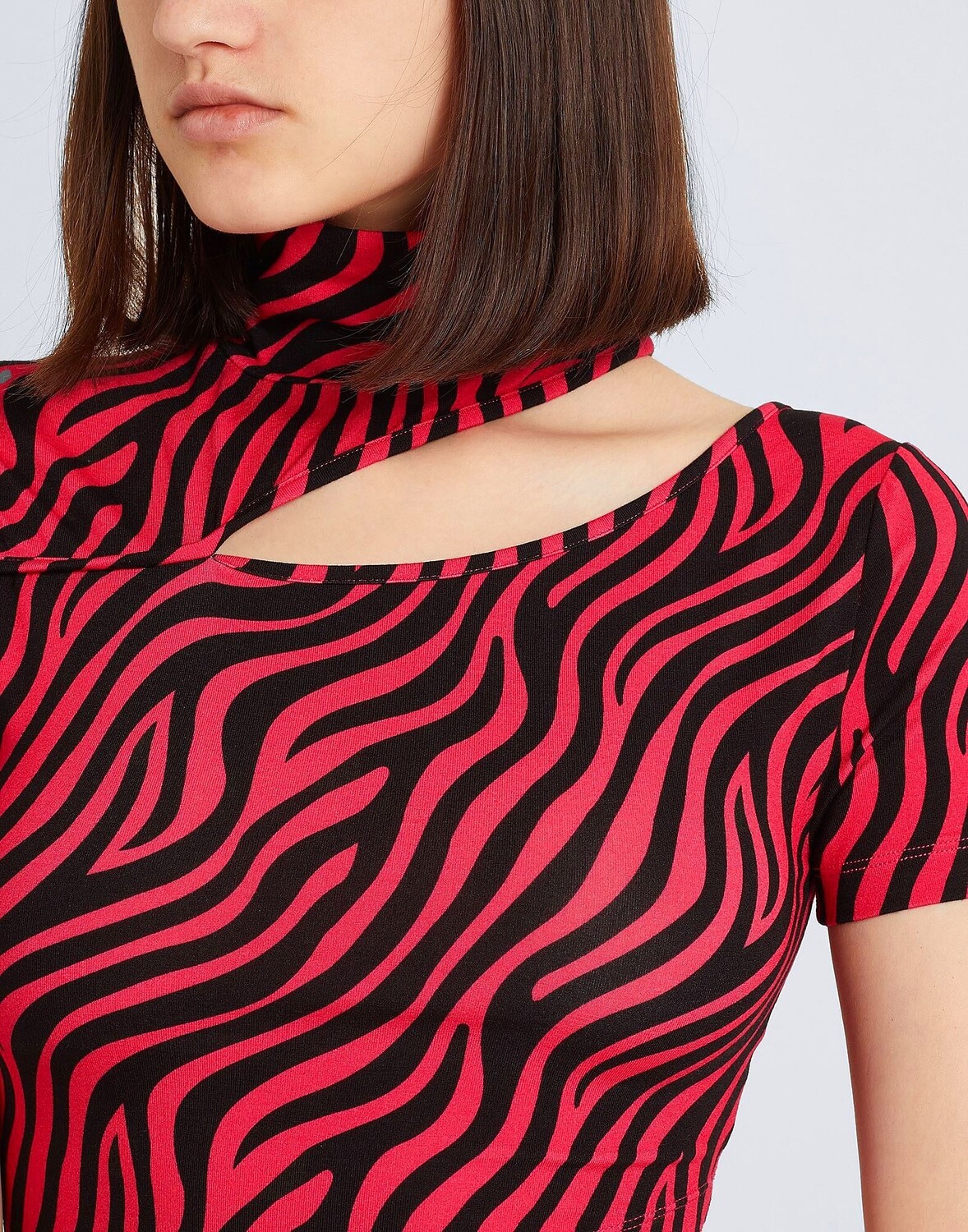 Джерси, вырез, зебра, водолазка, короткие рукава, без карманов, асимметричный низ, стрейч, укороченная футболка