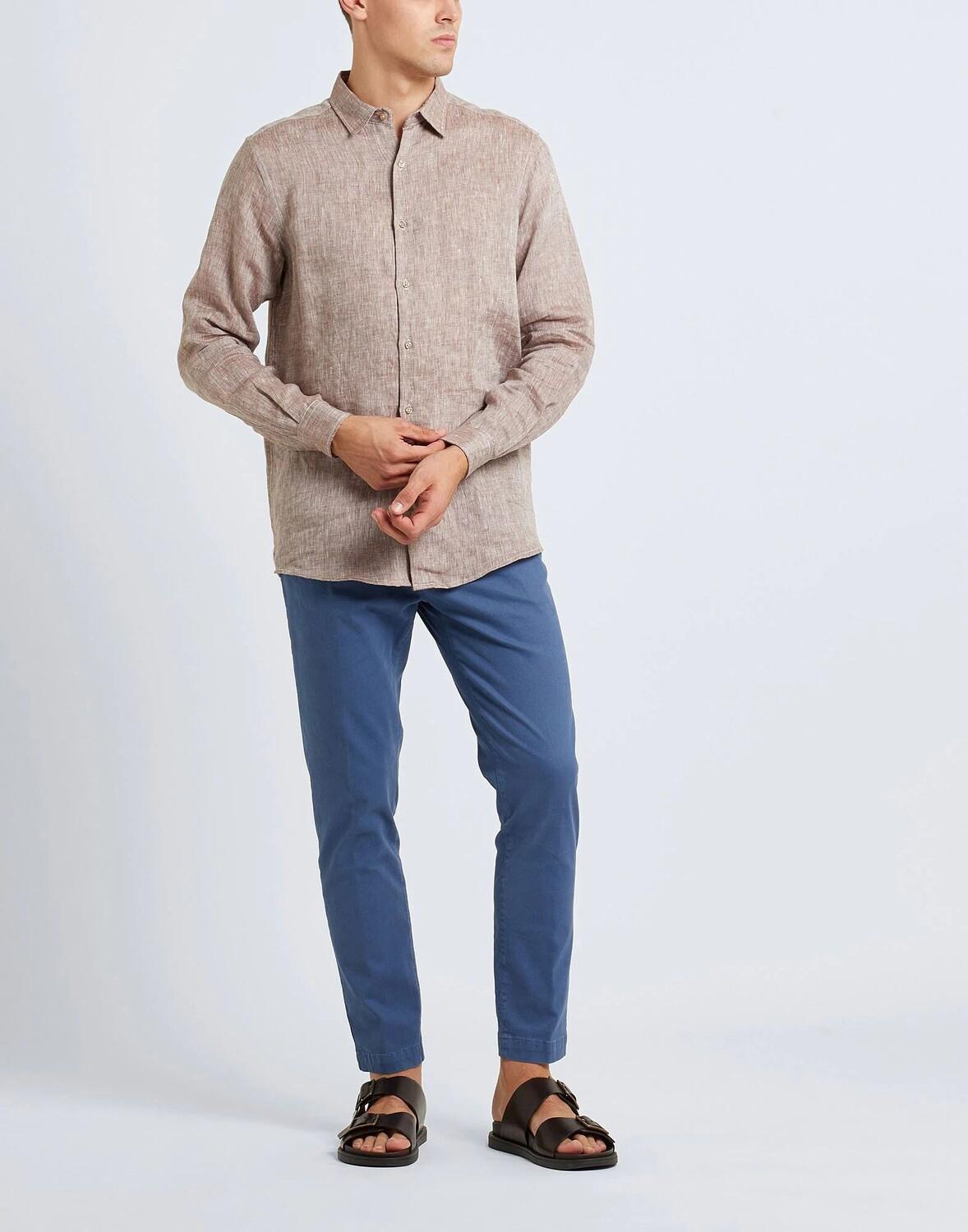 Эта рубашка с длинными рукавами полностью изготовлена ​​в Италии из однотонного льна. Классический воротник, планка с пуговицами спереди и манжеты на пуговицах идеально подходят для солнечного сезона. На модели итальянский размер M/48.