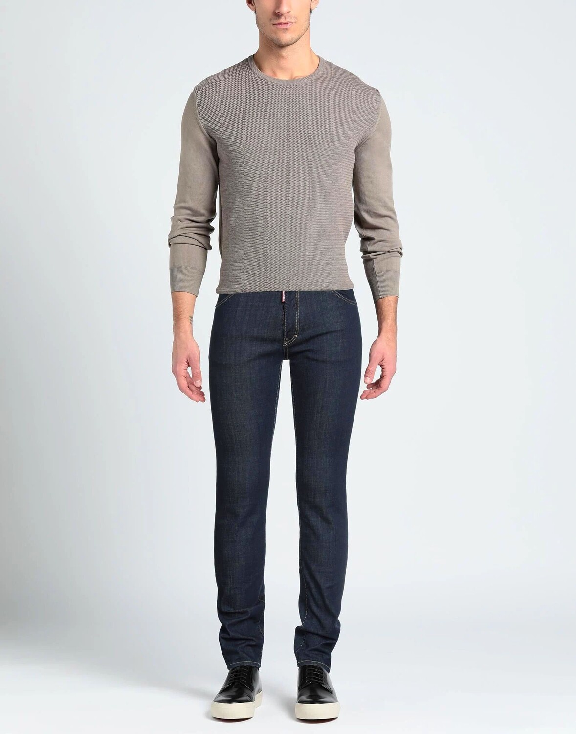 Джинсовая ткань, логотип бренда, одноцветное изделие, темный цвет, завышенная талия, зауженные брюки, узкие брюки, пуговицы, пять карманов, модель скинни