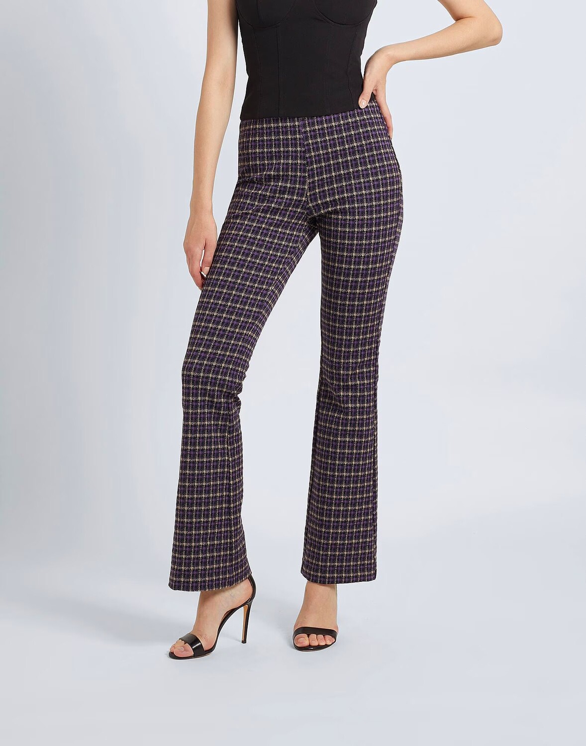 Трикотаж, без аппликаций, узор «гусиные лапки», завышенная талия, талия на резинке, расклешенный крой, стандартный крой, расклешенный низ, без карманов, стрейч, брюки. Этот предмет одежды содержит цифровой идентификатор, что означает, что вы можете открыть для себя целый мир эксклюзивного контента о своем изделии; отсканируйте QR-код на этикетке по уходу за товаром.