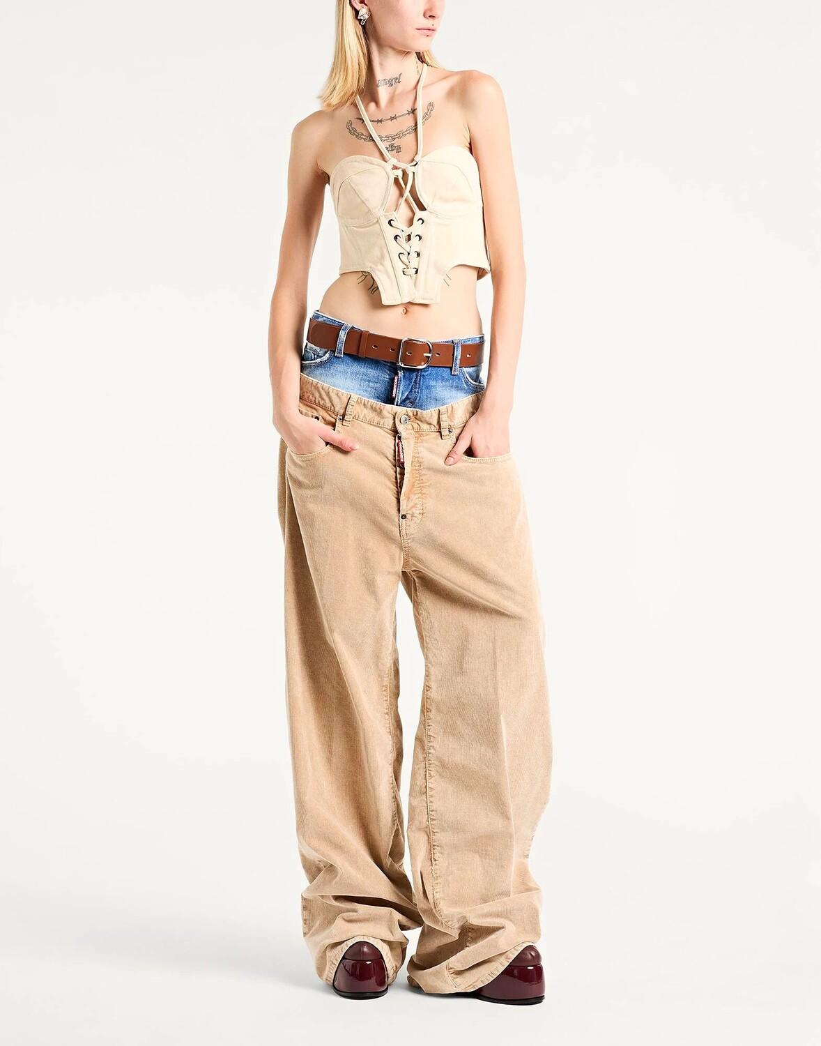 Вельвет, джинсовая ткань, логотип бренда, кожаная отделка, двухцветный, завышенная талия, широкие брючины, свободный крой, застежка на пуговицы, множество карманов, стрейч, машинная стирка, нельзя сушить в барабане, не отбеливать, содержит нетекстильные части животного происхождения , брюки