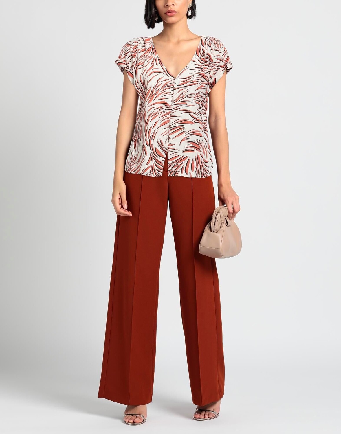 Тканое, присборенное, разноцветное, v-образный вырез, короткие рукава, застежка на пуговицы, рубашка