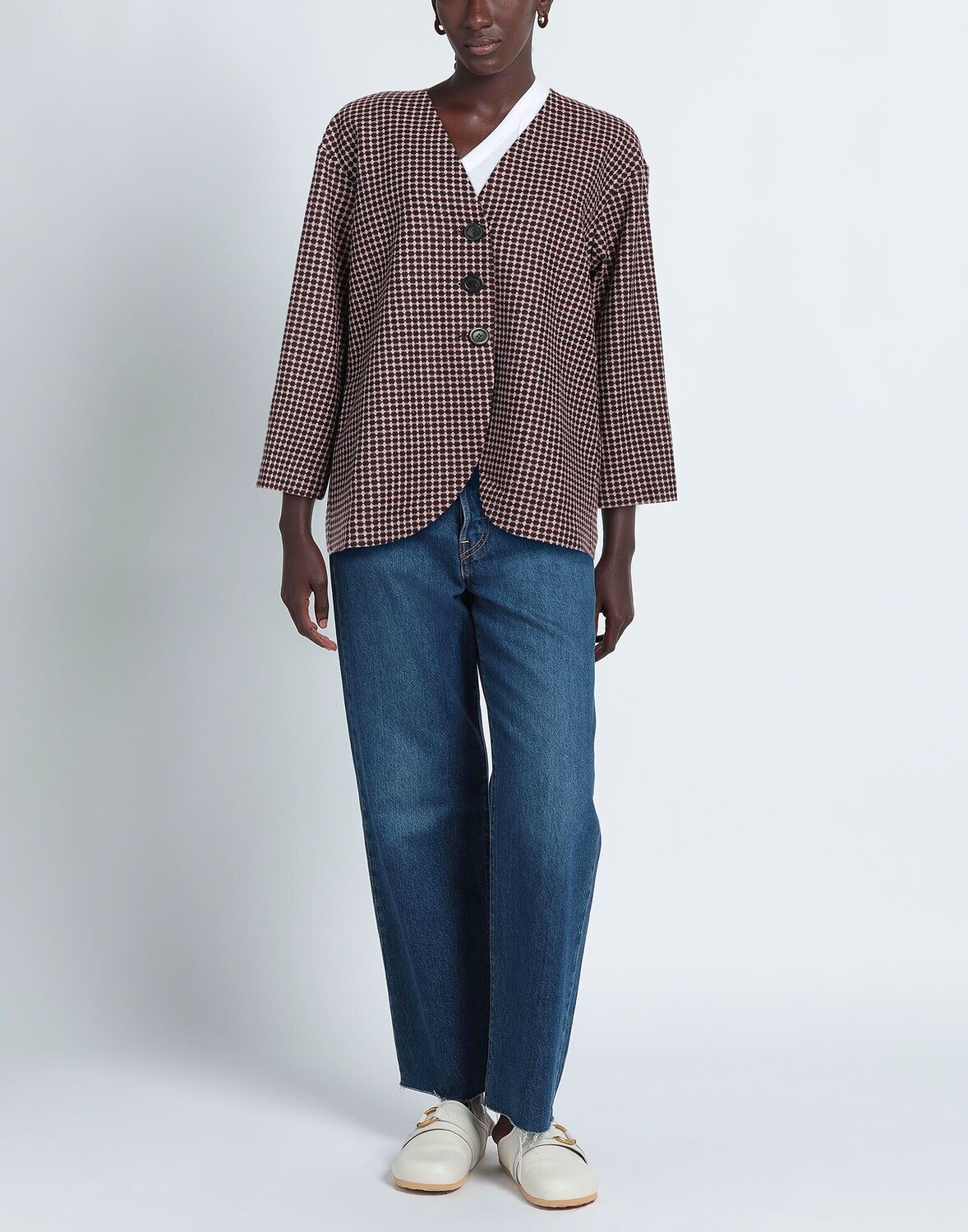 Твид, без аппликаций, геометрический принт, глубокий вырез, длинные рукава, внутри на подкладке, застежка на пуговицы, множество карманов, стрейч, химчистка, не отбеливать, нельзя сушить в стиральной машине, куртка