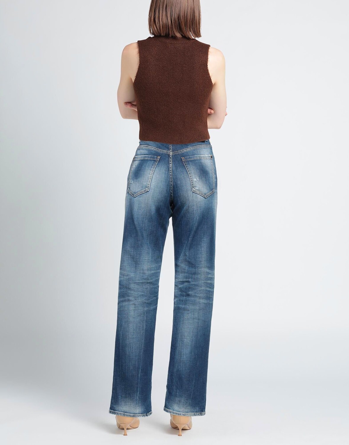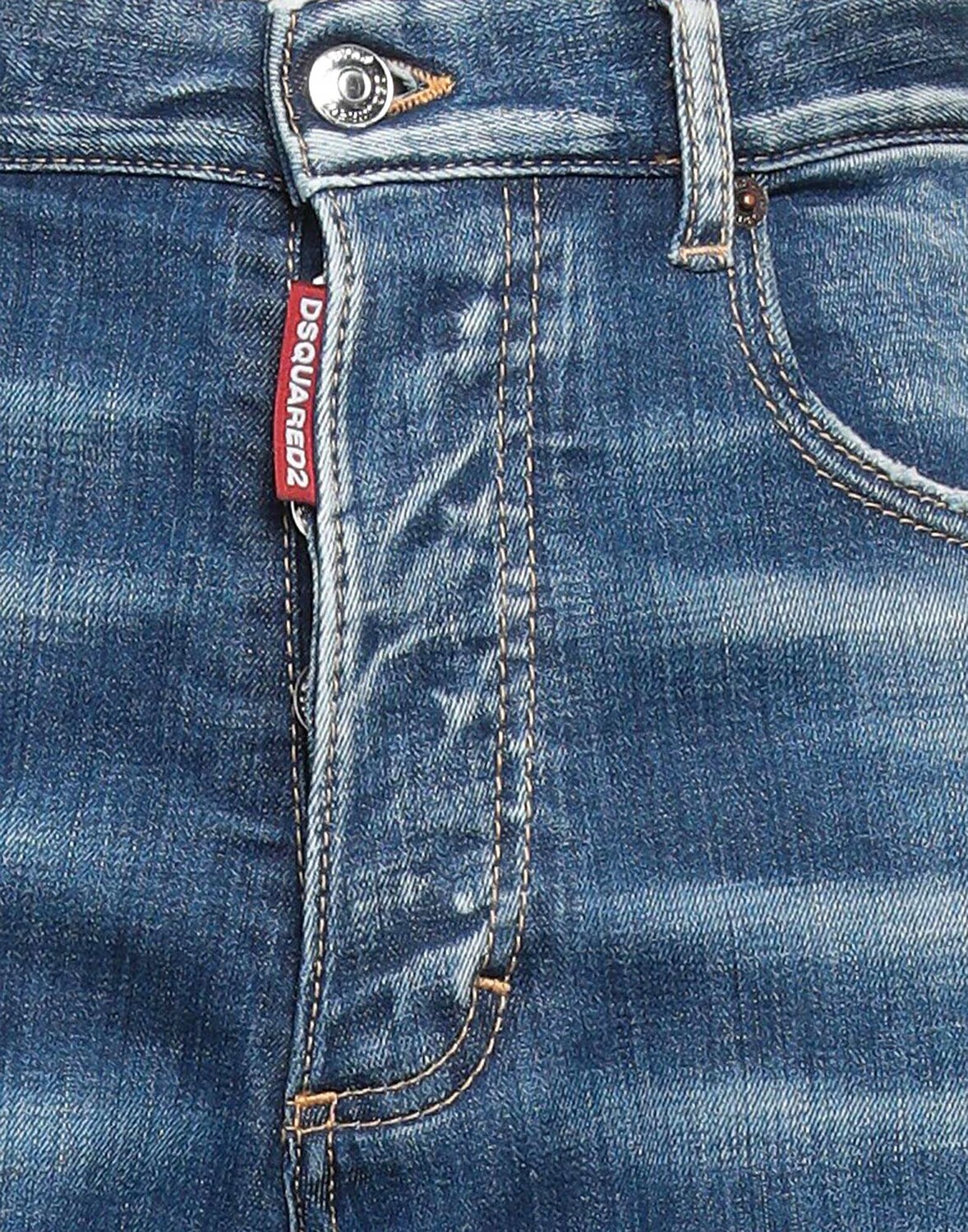 Деним, выцветшая, рваная ткань, логотип бренда, кожаные аппликации, одноцветное изделие, средняя стирка, завышенная талия, шлевки для ремня, прямые брючины, стандартный крой, пуговицы, пять карманов, стрейч, содержит нетекстильные части животного происхождения, мама- вырезанная модель