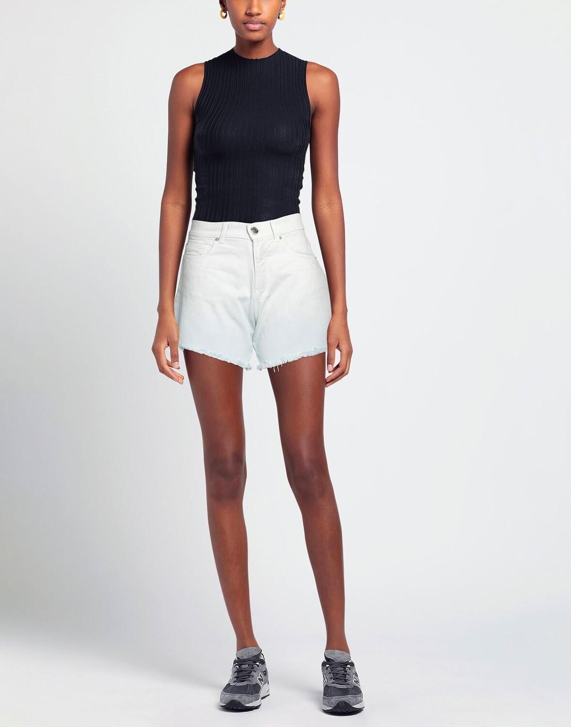 Джинсовая ткань, потертость, логотип бренда, кожаная отделка, одноцветное изделие, светлая стирка, завышенная талия, застежка-молния, 1 пуговица, необработанный низ, множество карманов, содержит нетекстильные части животного происхождения, шорты
